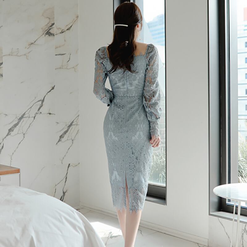 春秋 スリムレース ステッチ ミッド ロングパーティードレス パッケージ ヒップレースドレス スプリング 春物 オータム 秋物