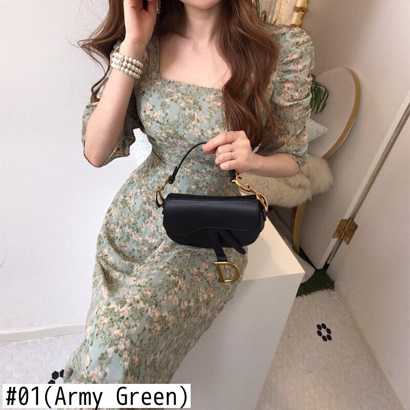 ドレスシックなジェントルスリムラップヒップスクエアネックフローラルシフォンドレス女性パフプリーツスリーブレースアップヴィンテージVestido 花柄 スクウェア ビンテージ