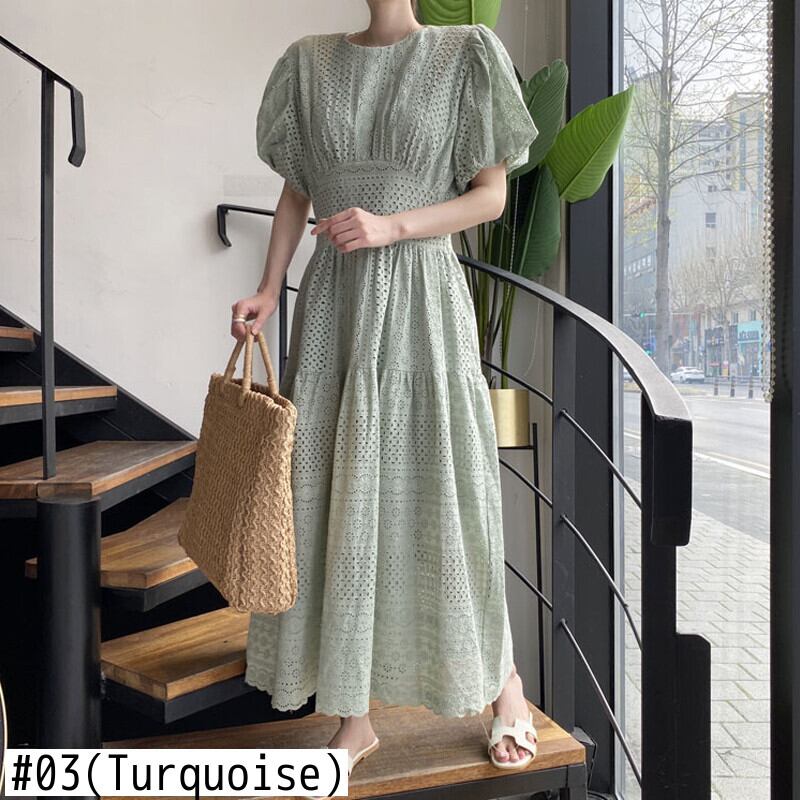 2021年夏の滑走路ドレスセクシーな中空アウト刺繡レースロングドレス女性パフスリーブドレス 刺繍 サマー 夏物