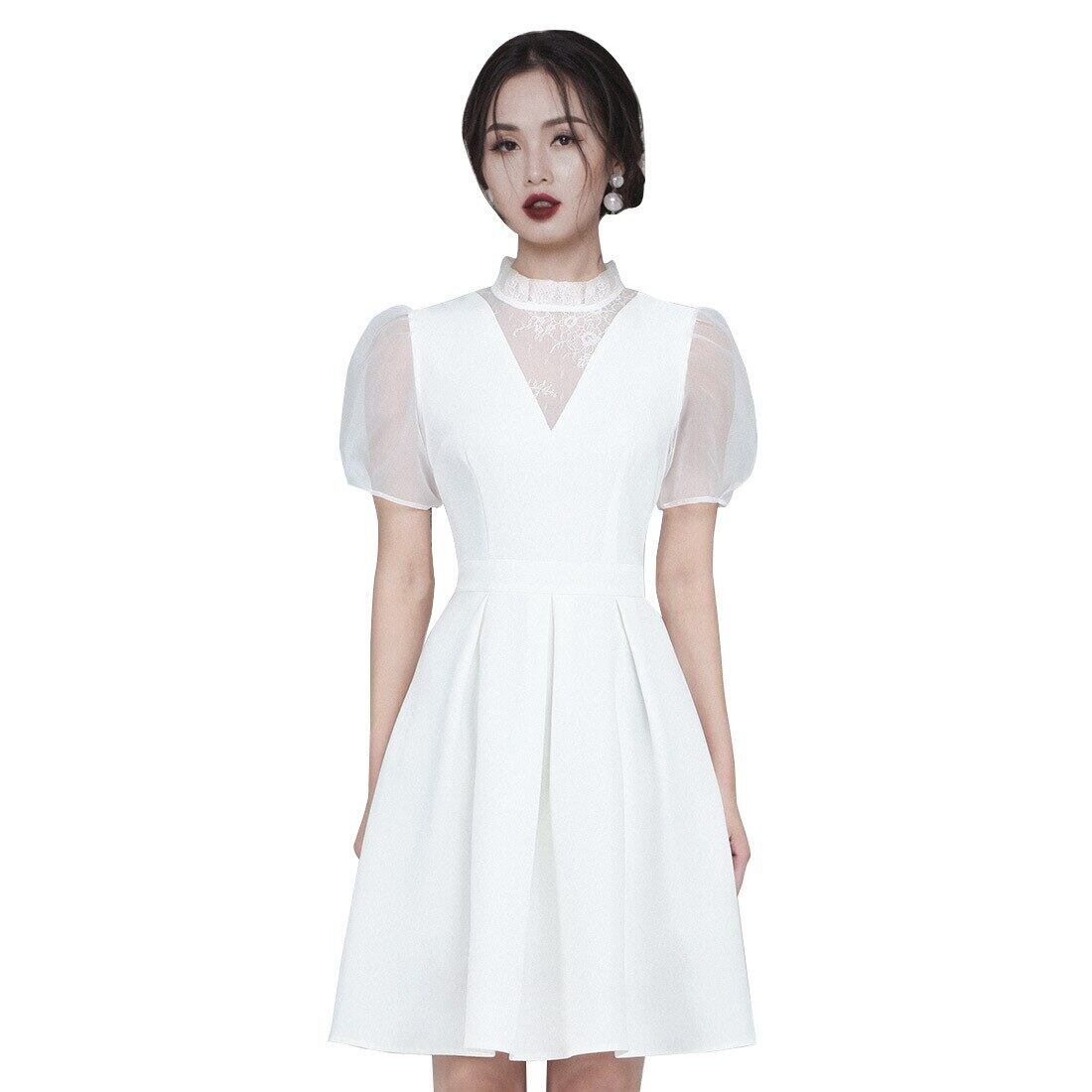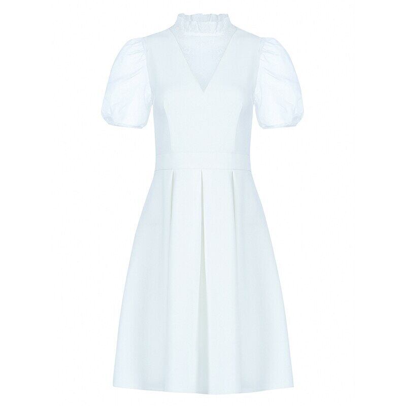 スタンドネック シフォンパフ 半袖 メッシュレース パッチワーク レディース パーティー ミニドレス ホワイト ショート ハーフスリーブ 会社 学校 通勤や通学にも
