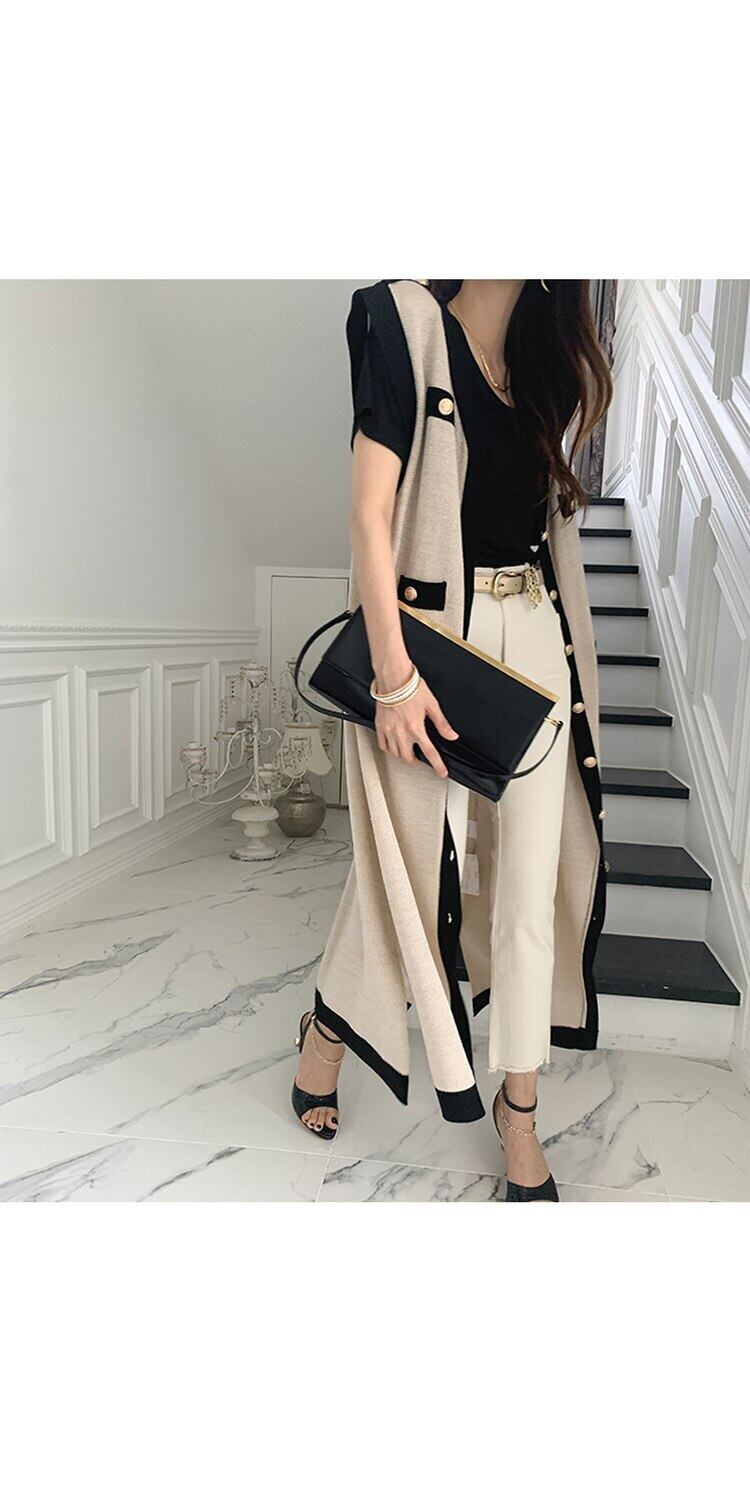 女性ドレスボタンVネック2021夏ノースリーブコントラストカラーシングルブレストサッシュニットドレス サマー 夏物