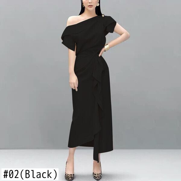 2ピースセット レディース サマースラッシュネック 無地トップス&ウエスト フリル ロングスカート ラッフル 夏物 ソリッドカラー