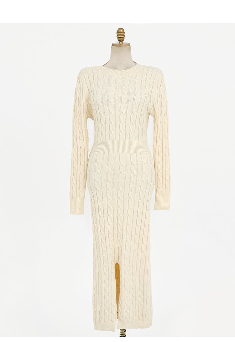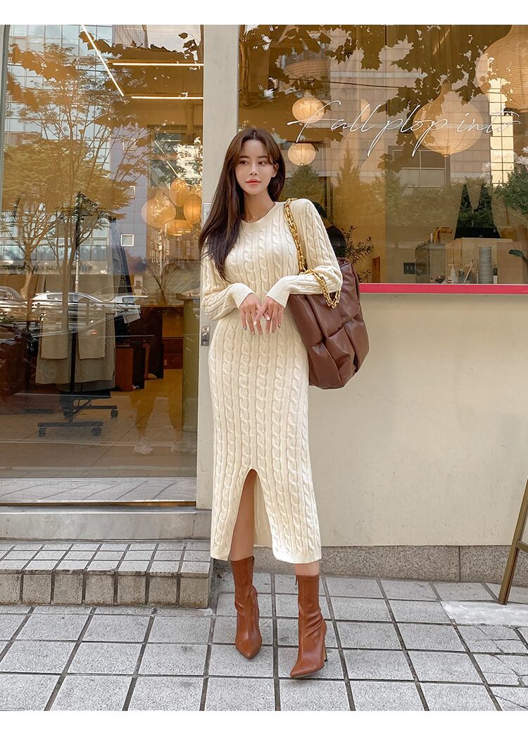 秋冬女性長袖Oネックスプリットツイストウォームシックセータードレスボディコンプルオーバーミディニットドレス ロング オータム 秋物 ウィンター 冬物