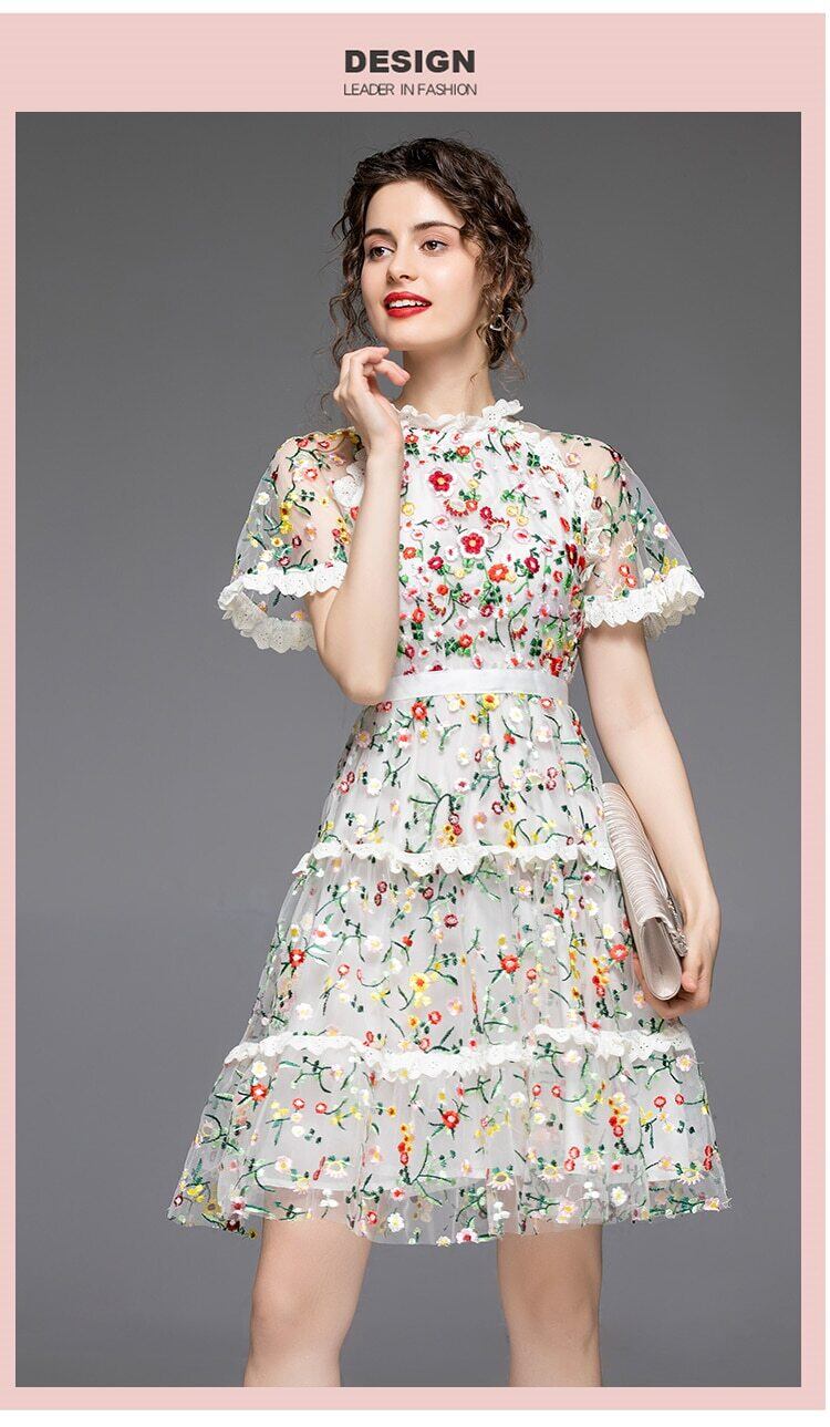ラグジュアリーレディース半袖パーティードレス サマーメッシュパッチワーク刺繡ドレスレトロフローラルドレス ショート ハーフスリーブ 刺繍 夏物 花柄