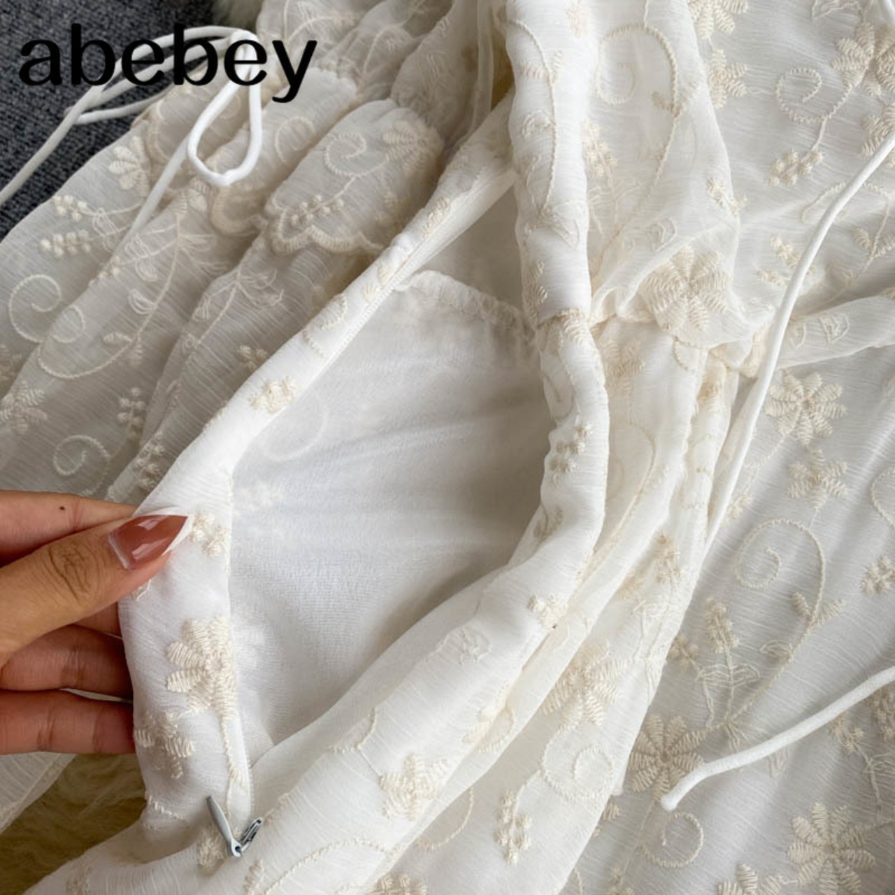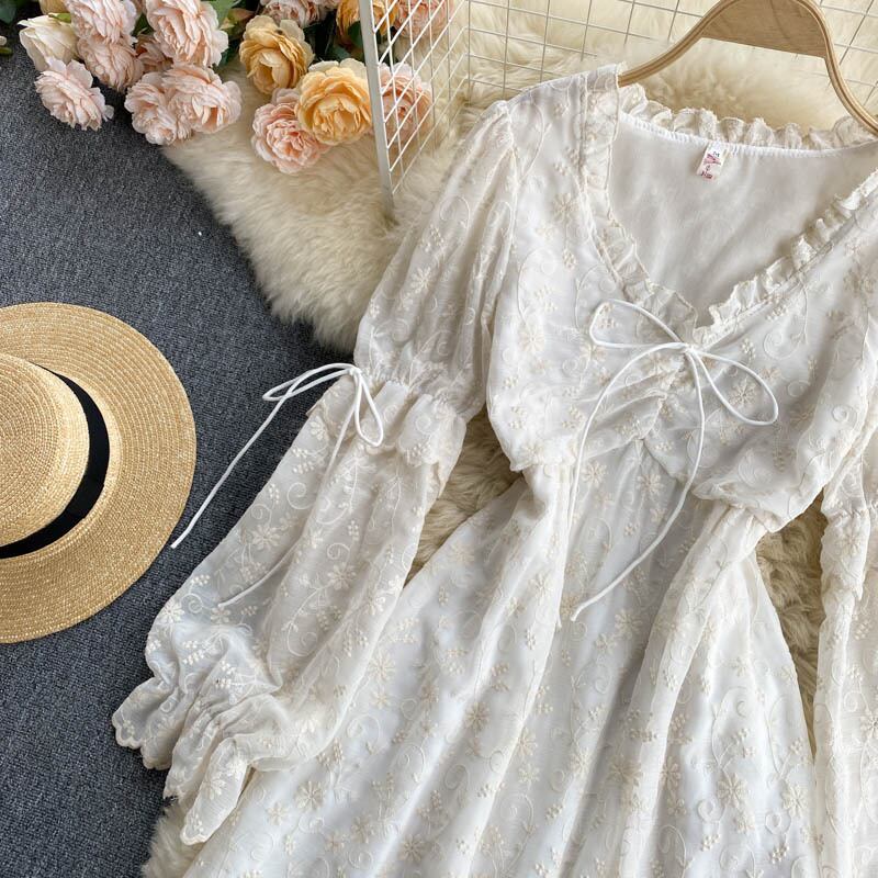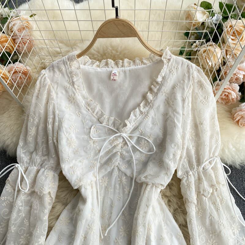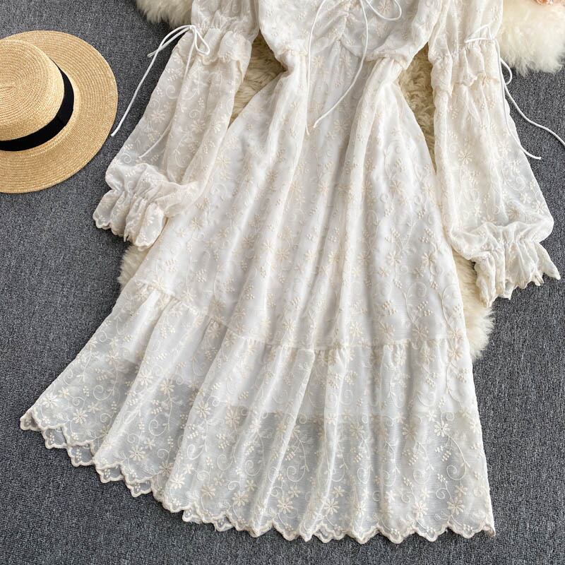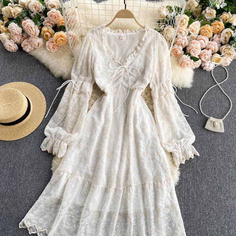 フレンチレースドレス女性巾着シャーリングVネック長袖Aラインドレスサマーボヘミアンプリントホリデーミディドレス ロング 夏物