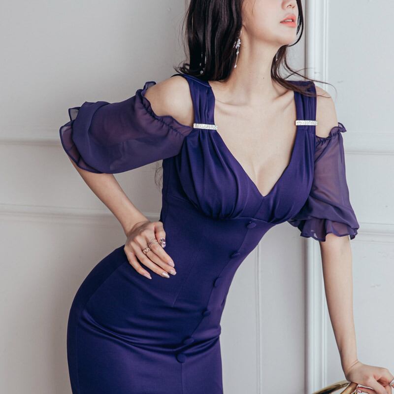 夏のセクシーなパーティーシースの女性セクシーなオフショルダーVネックパッチワークメッシュスリムペンシルパープルニードレス サマー 夏物