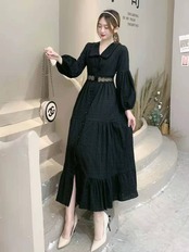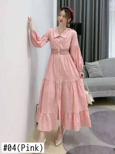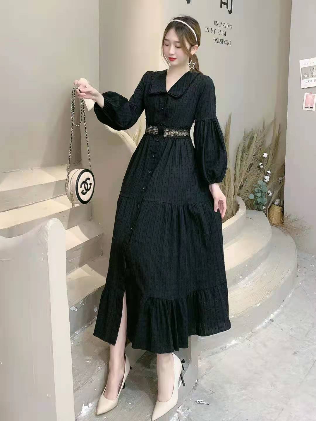 2021年春秋ターンダウンカラー長袖ワンピースシングルブレストレースパッチワークハイウエストロングAラインワンピース ハイウェスト スプリング 春物 オータム 秋物