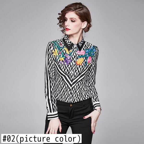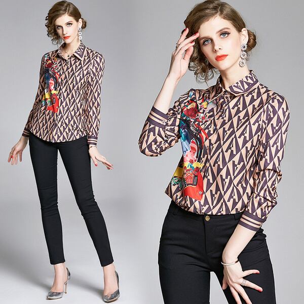 レターフラワープリント長袖レディースブラウスシャツサマーターンダウンカラーブラウスシャツワークウェアトップ ロング 夏物 フラワーデザイン