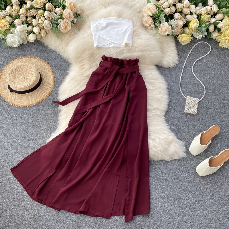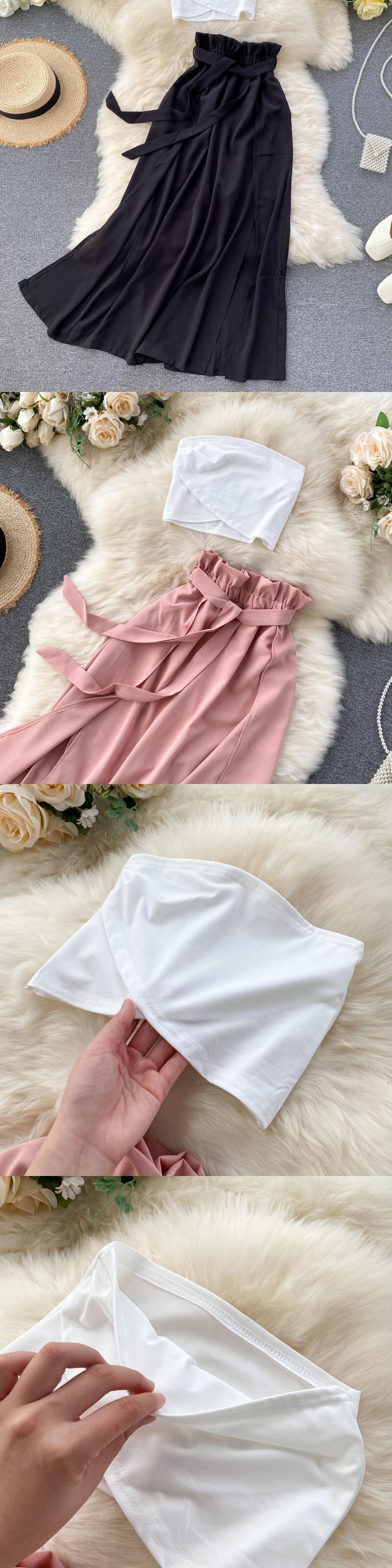 女性の夏のホリデースーツセクシーなノースリーブオフショルダーストラップレスショートトップ+ウエストスプリットスカート2点セット サマー 夏物