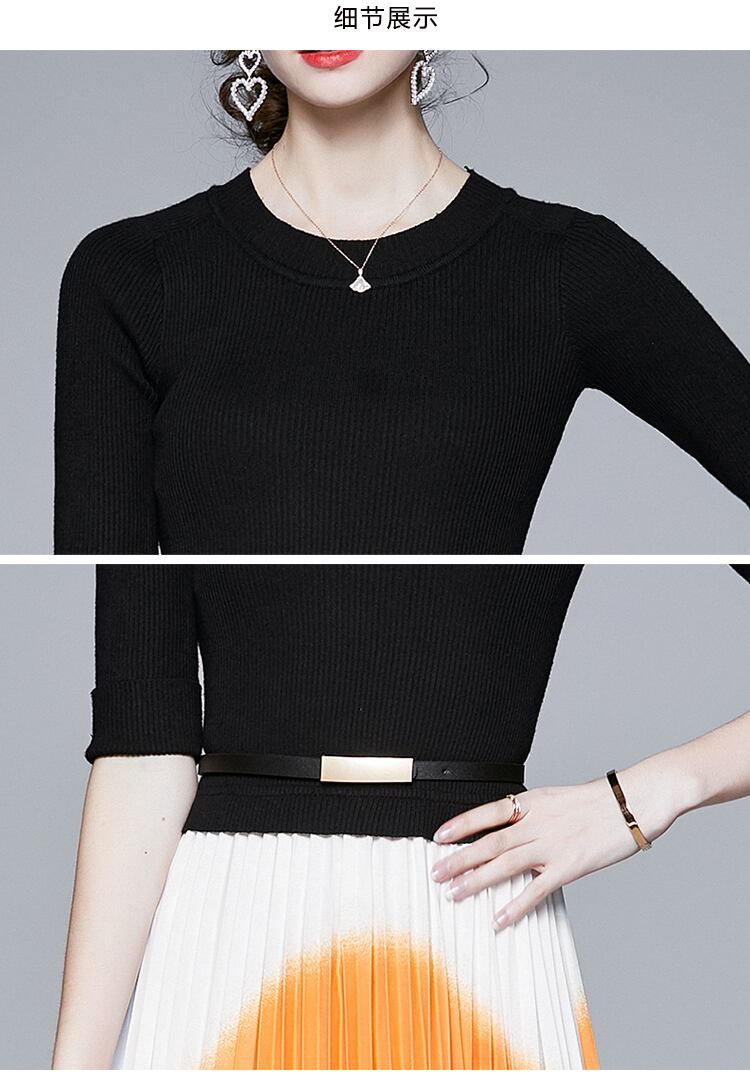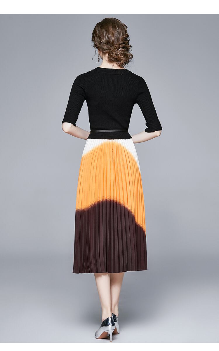 Elegnatオータムウォームニットステッチプリーツプリントヴィンテージスリムロングドレスラウンドネックブラックワークパーティードレス 秋物 Oネック ビンテージ