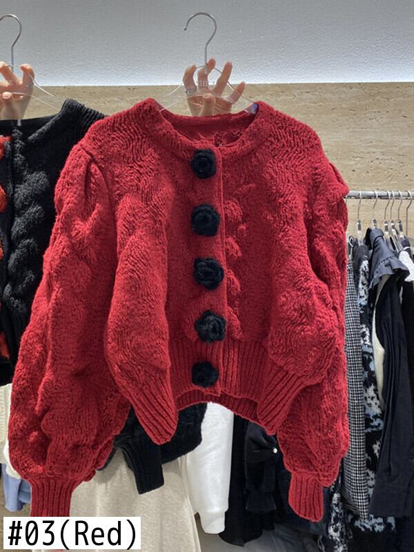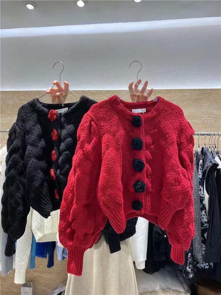 ヴィンテージフラワーカーディガンウーマンセーター2021年秋冬Oネックボタンアップジャケットルーズショートニットコート オータム 秋物 ウィンター 冬物 フラワーデザイン ビンテージ