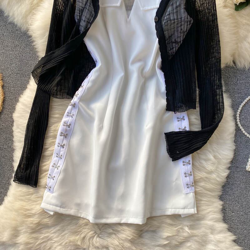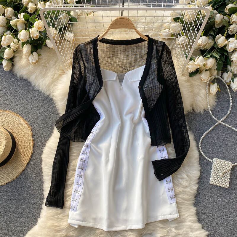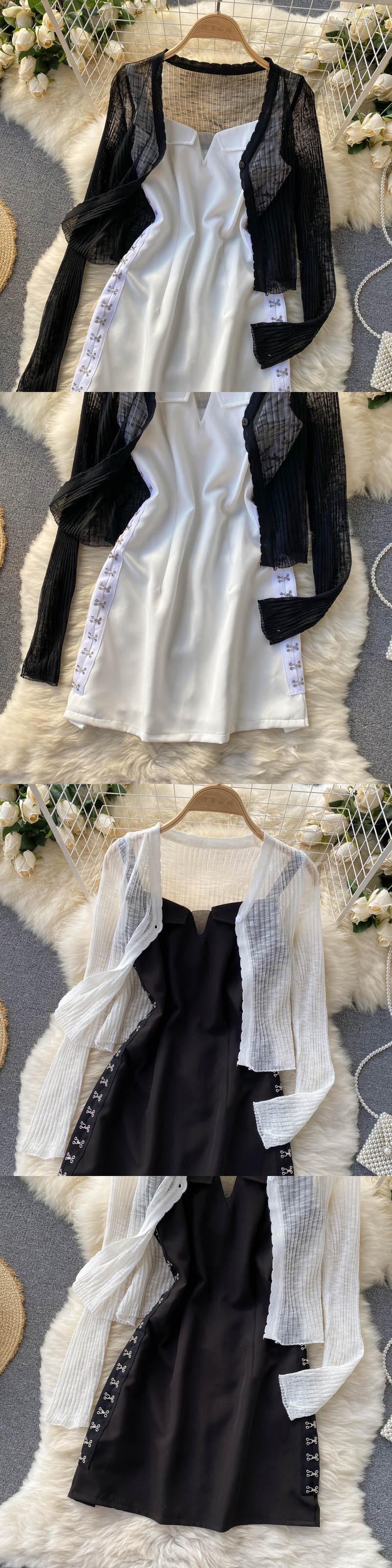 女性2021年夏のセクシーなノースリーブオフショルダーAラインストラップドレス+長袖日焼け防止ニットカーディガン ロング サマー 夏物