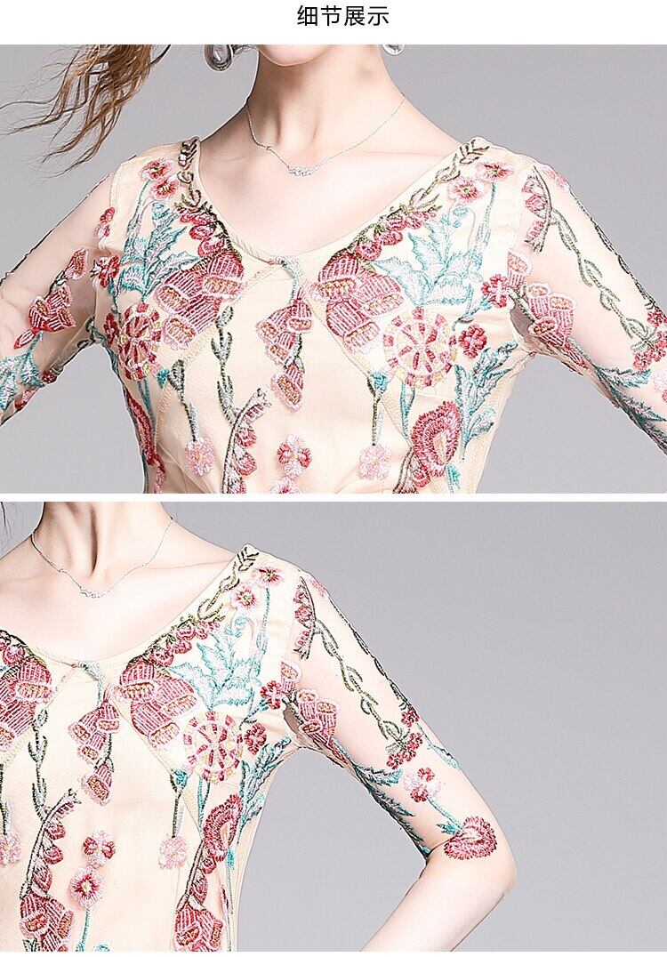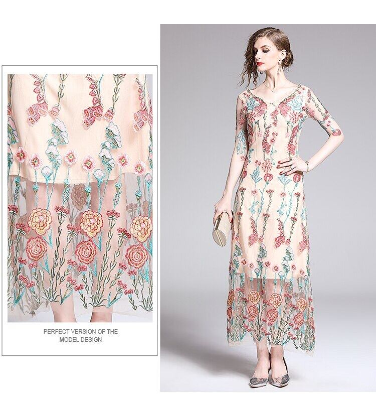 フラワーデザイン ワンピース ロングドレス 刺繍 サマー 夏物 メッシュ 花柄 Vネック Aライン スリム ビンテージ
