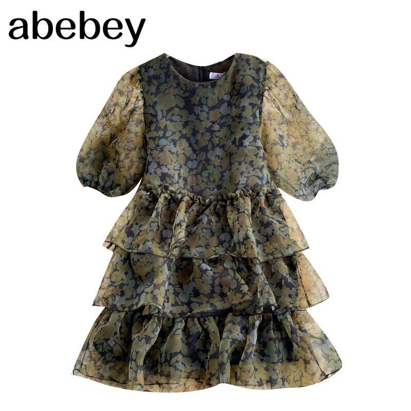 Retro vestido de Organza de moda Coreana de manga de soplo O cuello vestido de verano dulce en cascada vestido veraniego レトロ