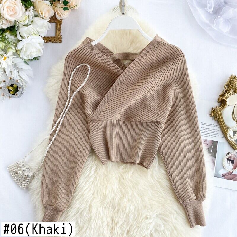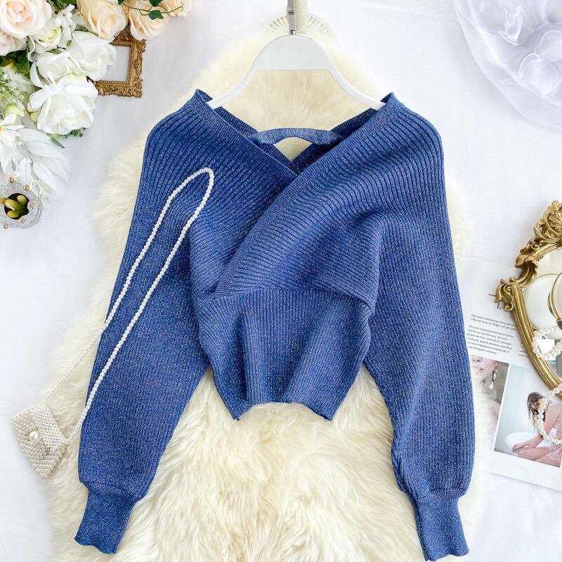 女性シャイニールレックスセーターVネックロングパフスリーブニットトップスオフショルダーセクシーエラスティックウエストニットブラウスセーター 伸縮