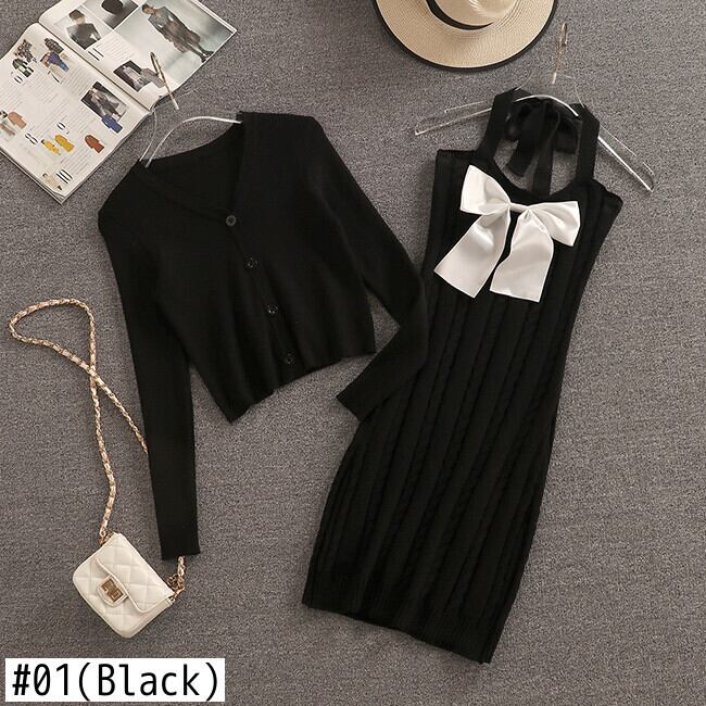 女性秋冬ツイストニットセット長袖ボタンカーディガン+セクシーハングネックノースリーブスリムストラップワンピース2点セット ロング オータム 秋物 ウィンター 冬物