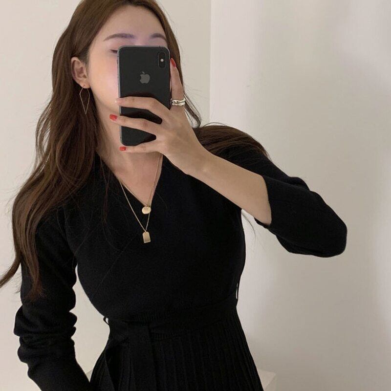 秋冬レディースドレスVネックプリーツベルト無地2色Aラインニット多目的スタイルミニドレス オータム 秋物 ウィンター 冬物 ハーネス ソリッドカラー