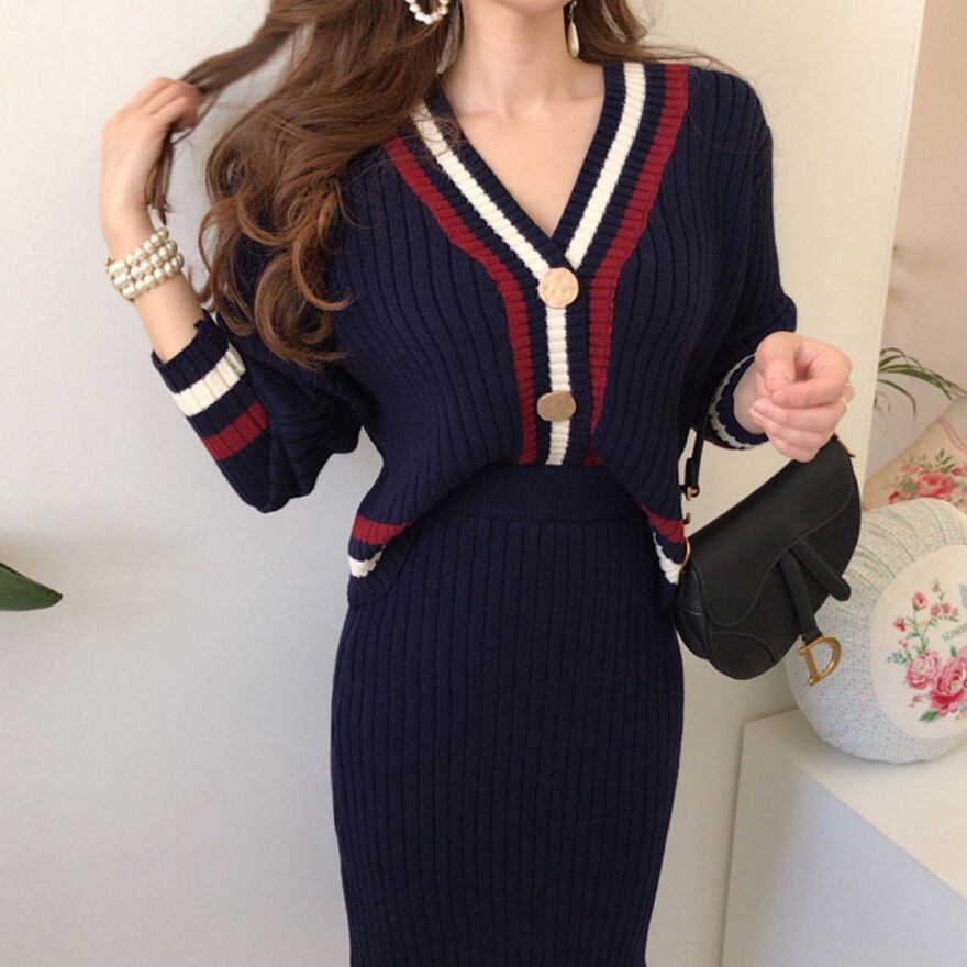 ツーピースセットレディース秋冬Vネックボーダーコントラストカラーニットセーター+ウエストボディコンスカート レッド オータム 秋物 ウィンター 冬物