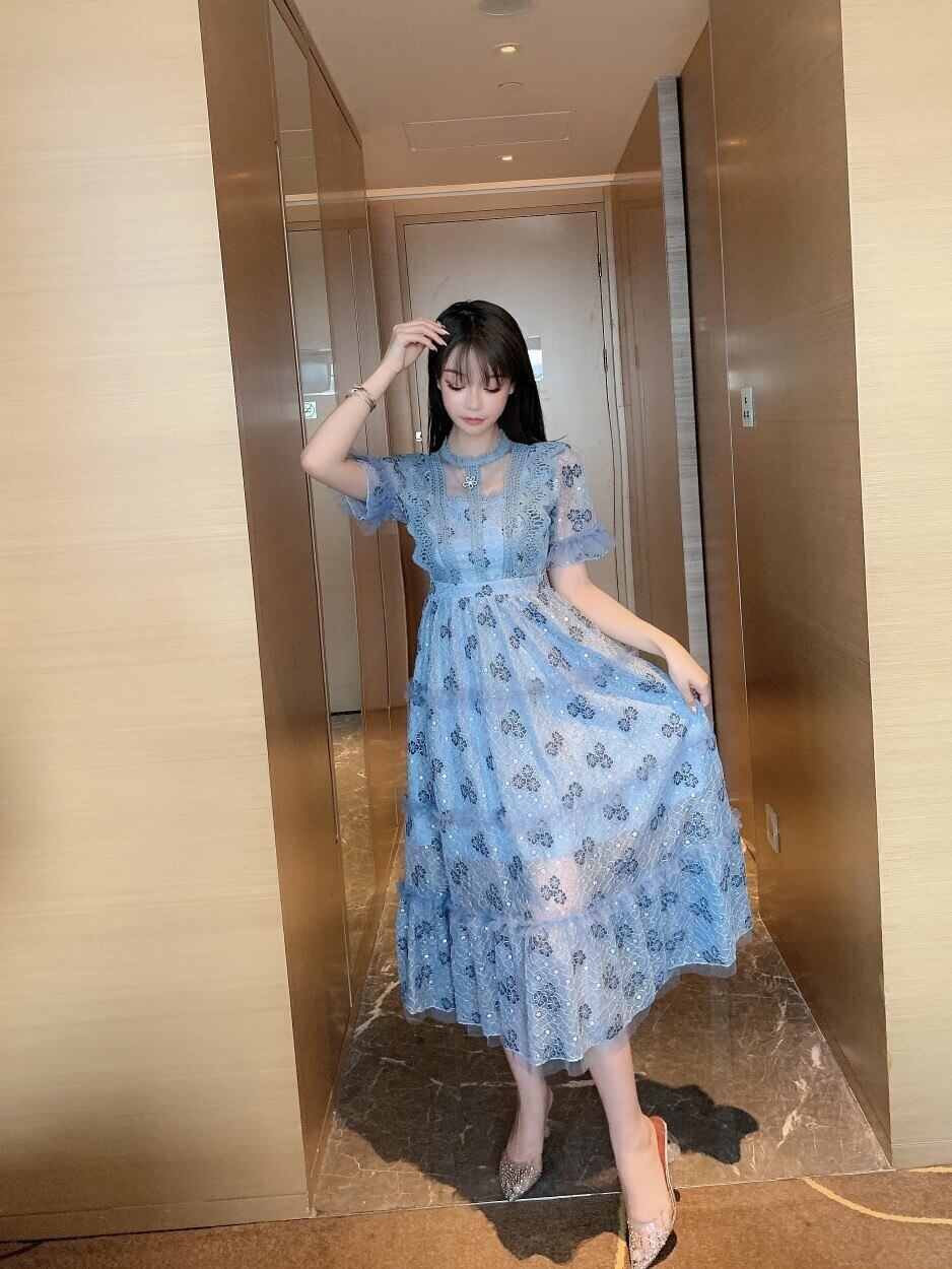 レースの女性のドレススタイル2021夏のミディドレスレースの刺繡シックな甘い半袖Vestido ショート ハーフスリーブ 刺繍 大人ガーリー スウィート キュート カジュアル サマー 夏物