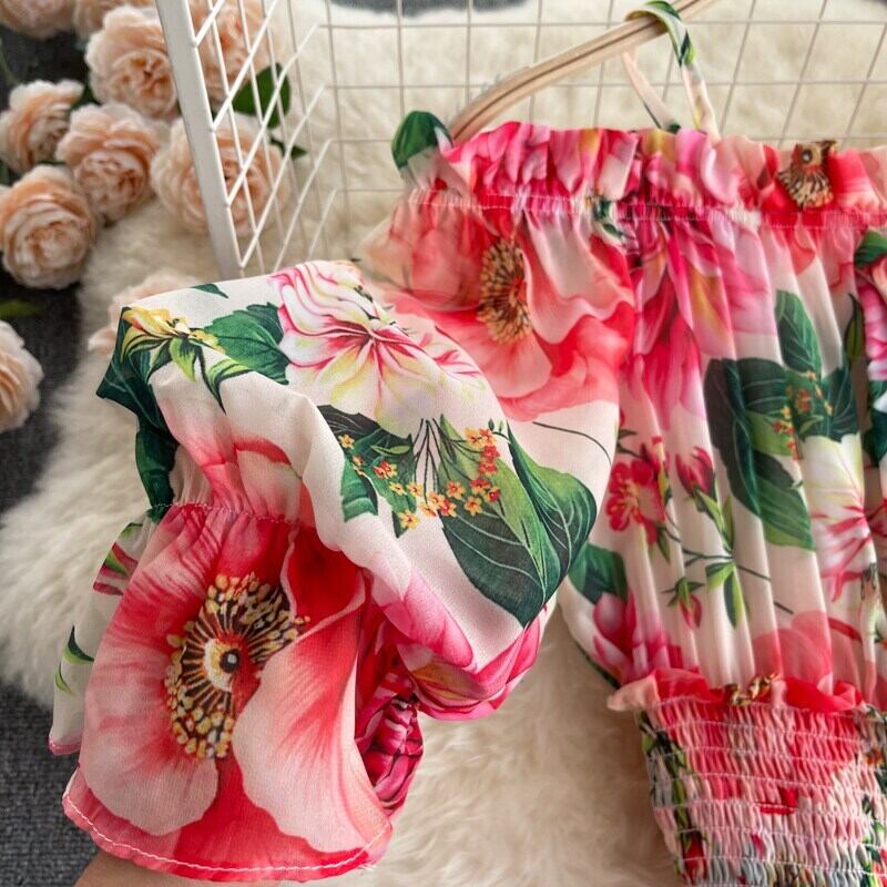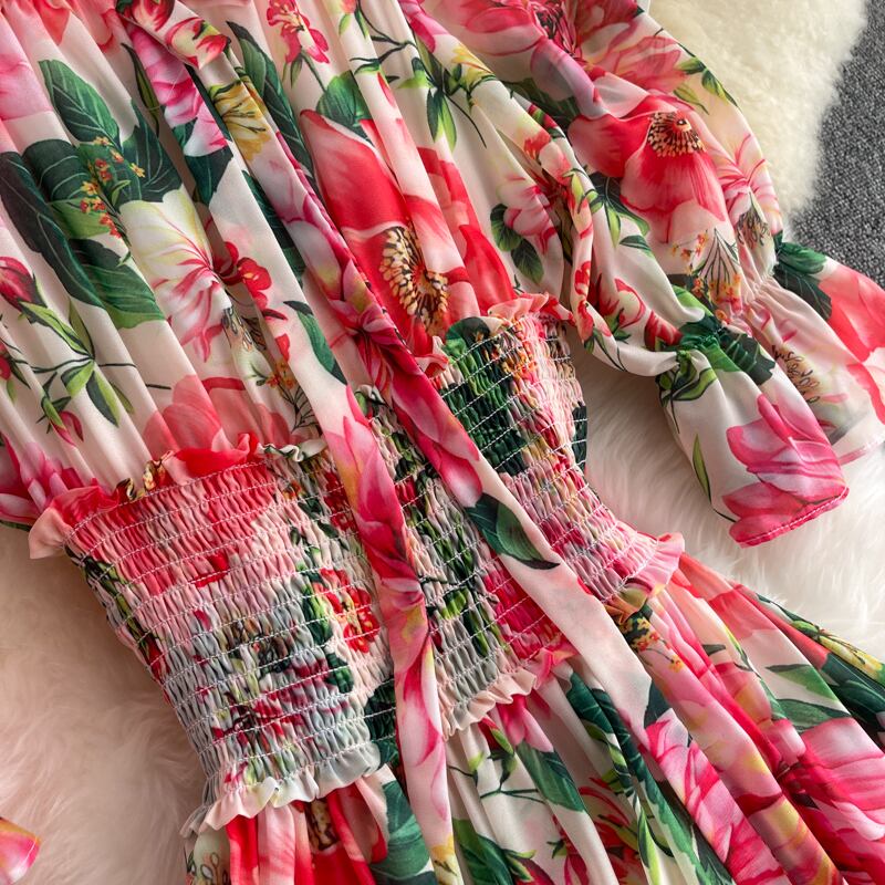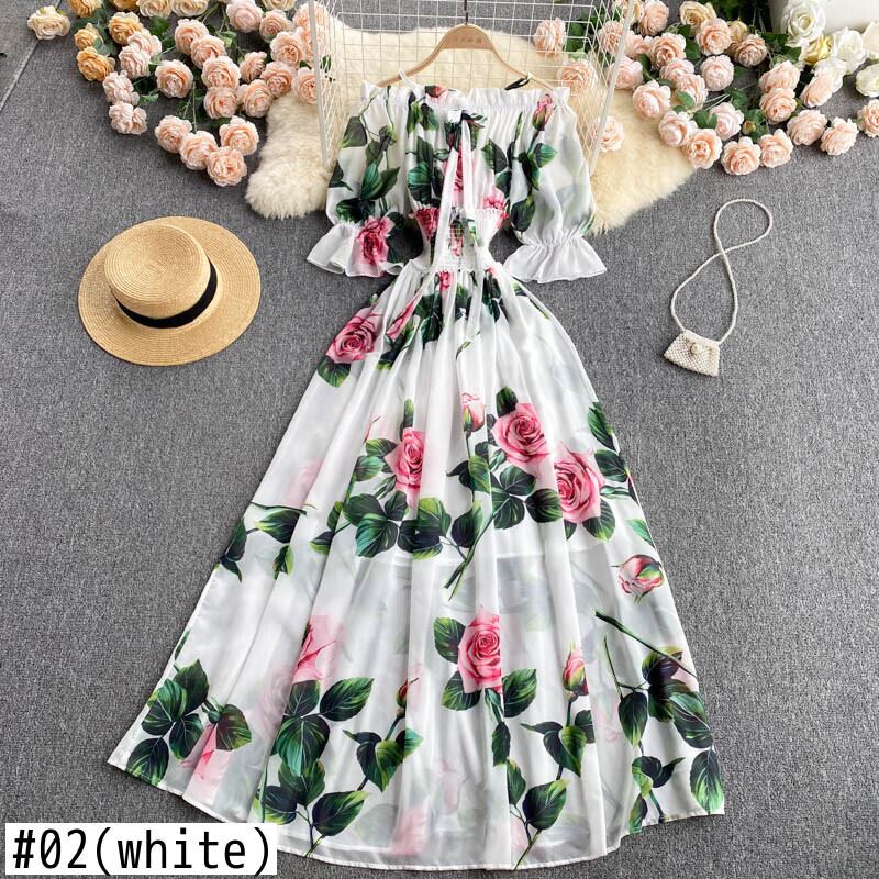 シフォンプリントストラップマキシドレス女性セクシーオフショルダー弾性シャーリングAラインドレス夏自由奔放に生きるホリデーサンドレス エラスティック 伸縮 サマー 夏物