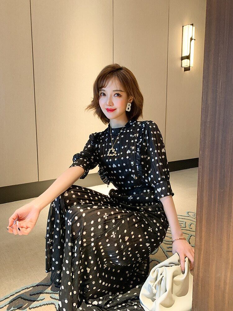 女性用水玉パンツスーツサマーシフォンOネックフリルシャツ+ホリデープリーツワイドレッグパンツセット ラッフル 夏物