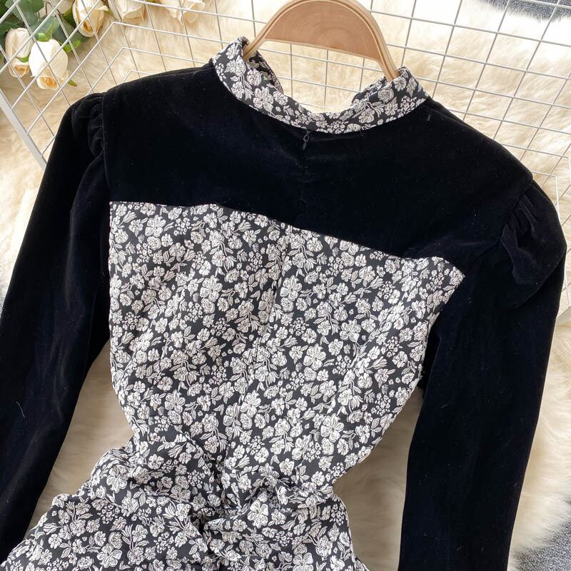 女性レトロフローラルドレス長袖Oネックスリムフリルマーメイドドレス秋フレンチボヘミアンプリントショートドレス ロング オータム 秋物 花柄