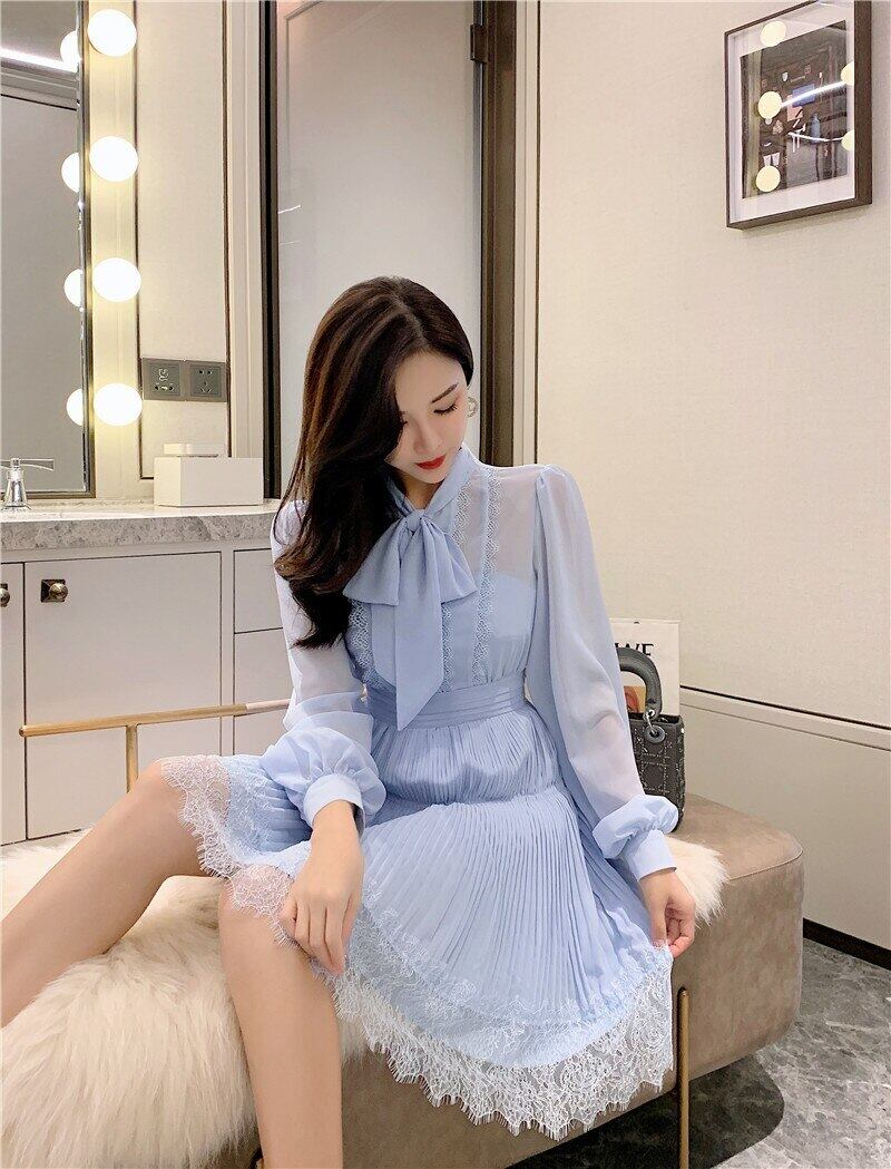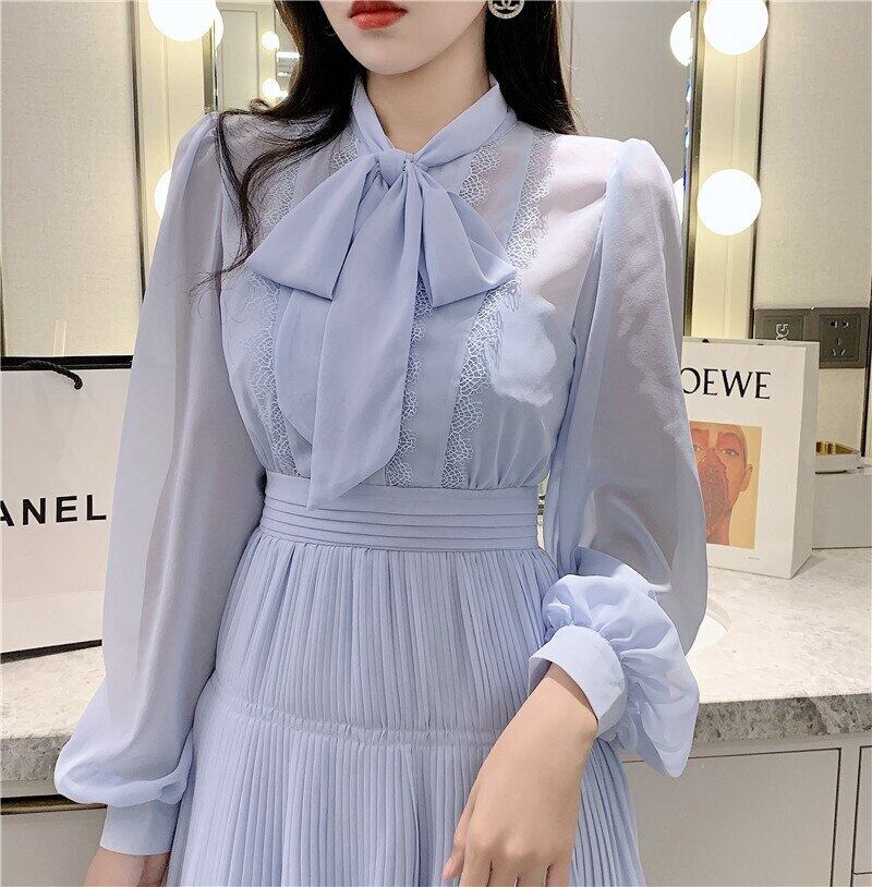 オータムブルーシフォンドレスウーマンランウェイロングスリーブボウネックパーティーウエストプリーツドレス リボン 秋物