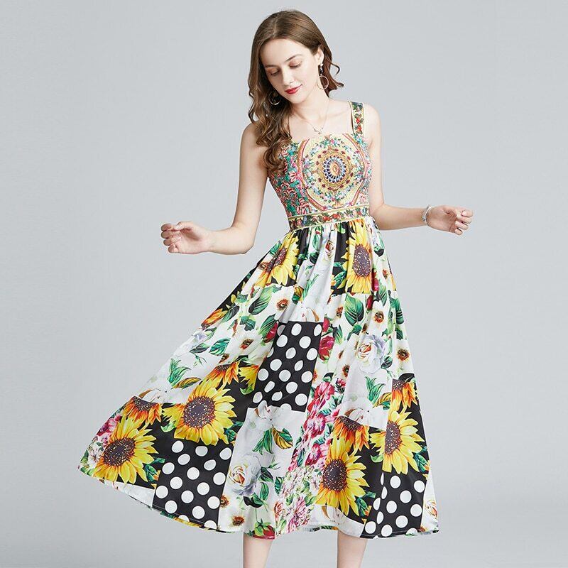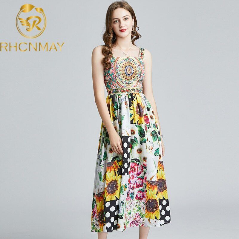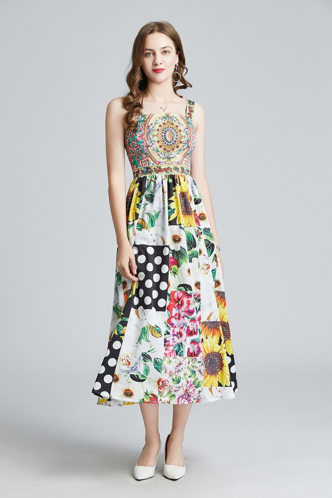 2021ランウェイレディースホリデードレス春夏フラワープリントシフォンセクシースパゲッティストラップドットミディサンドレス スプリング 春物 サマー 夏物 フラワーデザイン
