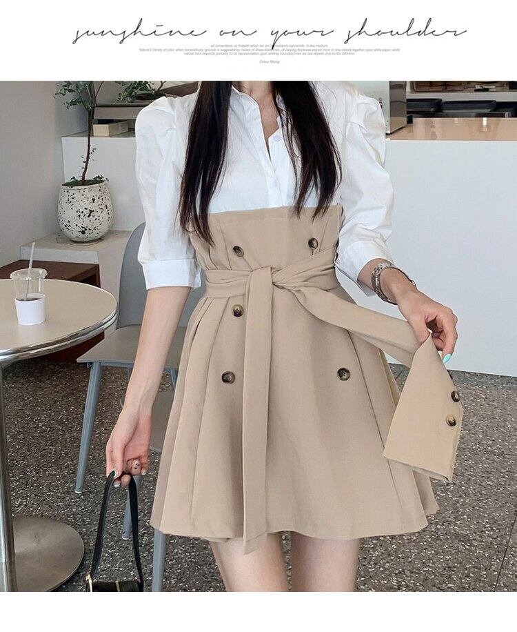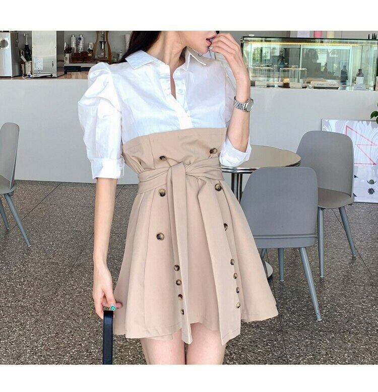 夏のレディースドレス シャツドレス 3/4袖 ダブルブレストベルトパッチワークドレス女性 サマー 夏物 ハーネス