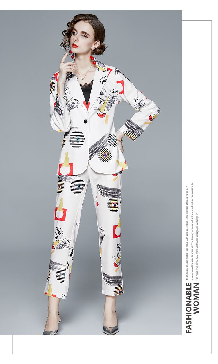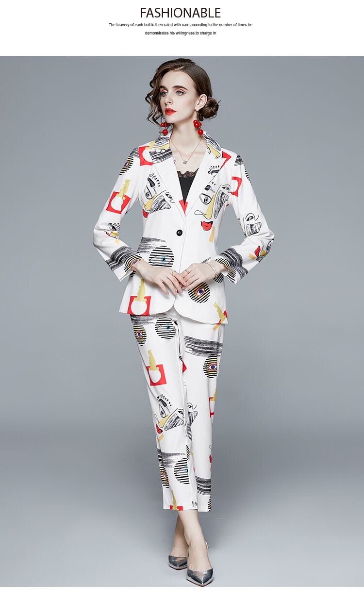 女性スーツオフィスセット長袖漫画幾何学模様ワンボタンターンダウンカラーブレザー+鉛筆パンツスーツ女性 ロング 会社 学校 通勤や通学にも