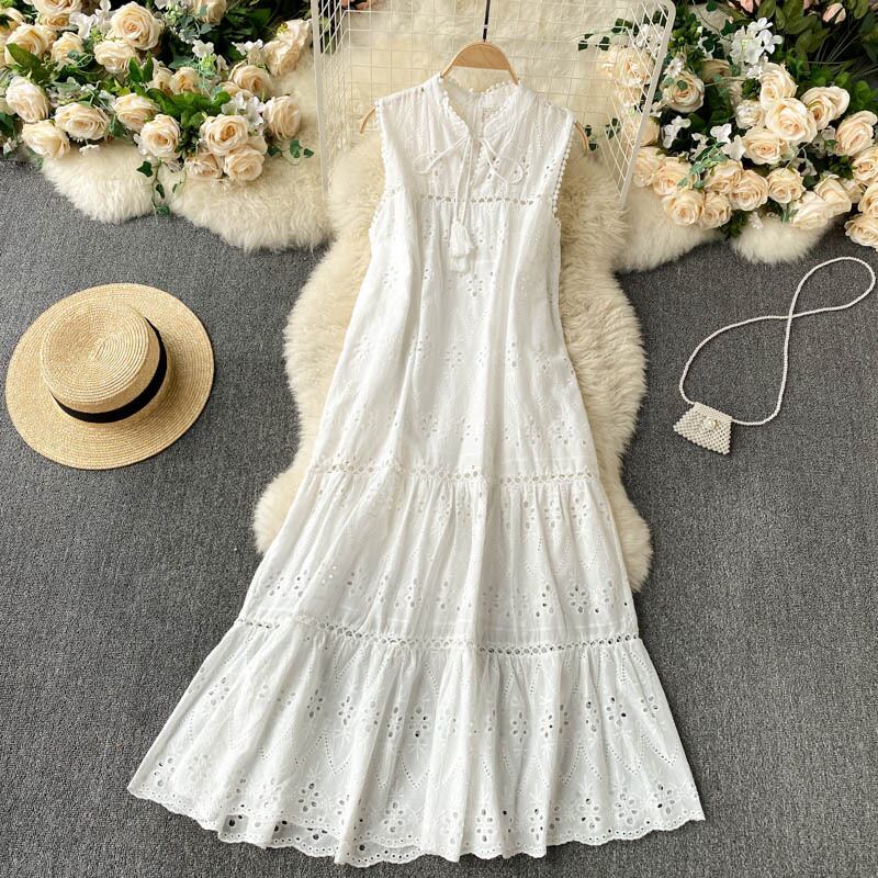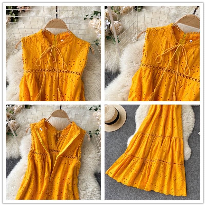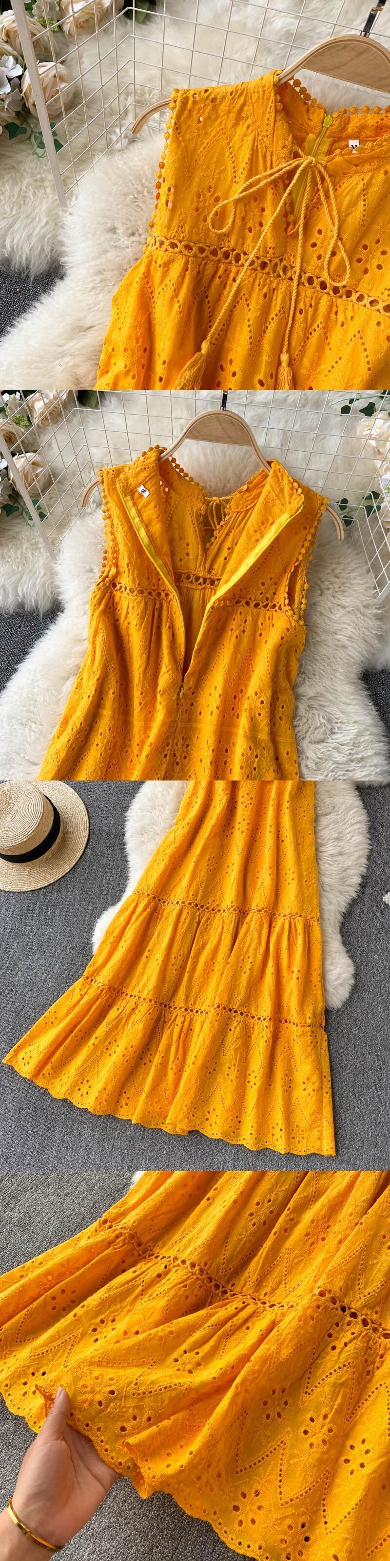 女性ノースリーブタンクドレス中空ソリッドAラインドレス夏の自由奔放に生きる休暇ミディドレス サマー 夏物 ソリッドカラー