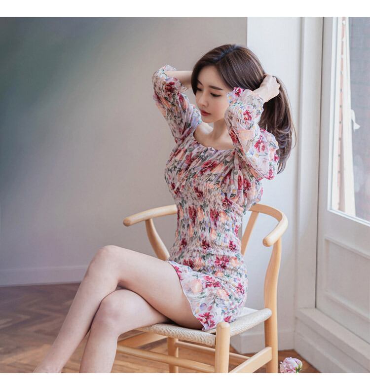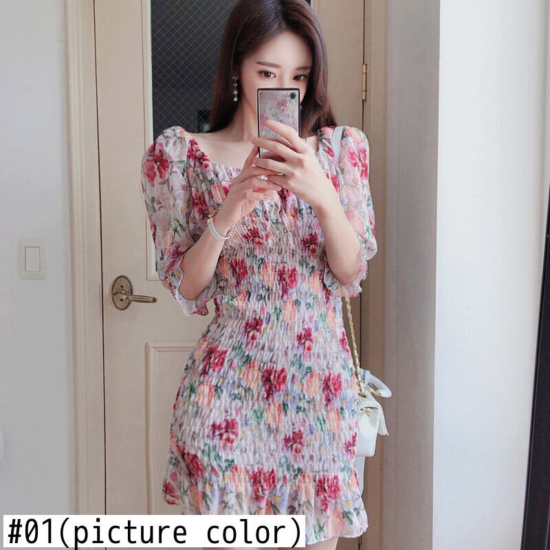 スタイルスクエアカラーパフスリーブシフォンドレス女性花柄スリムウエストヴィンテージドレスサマープリーツドレス 夏物 スクウェア ビンテージ