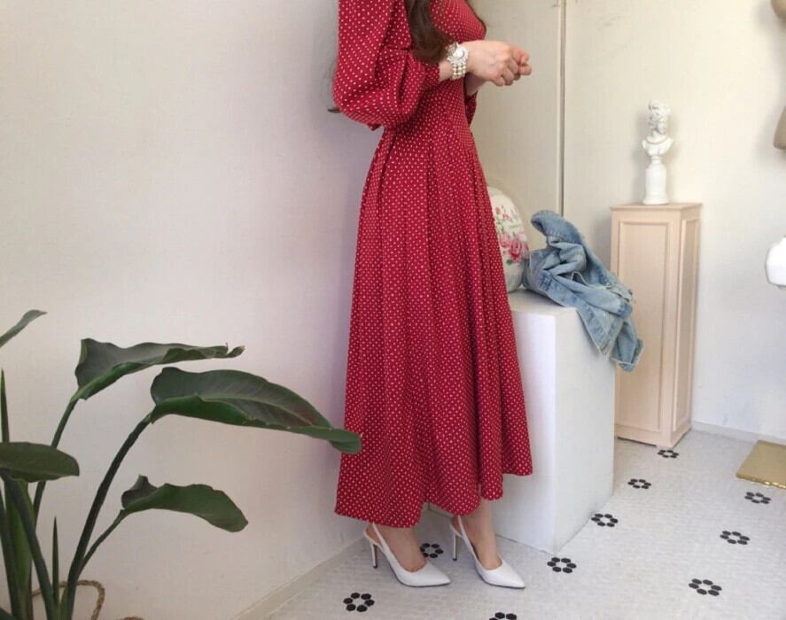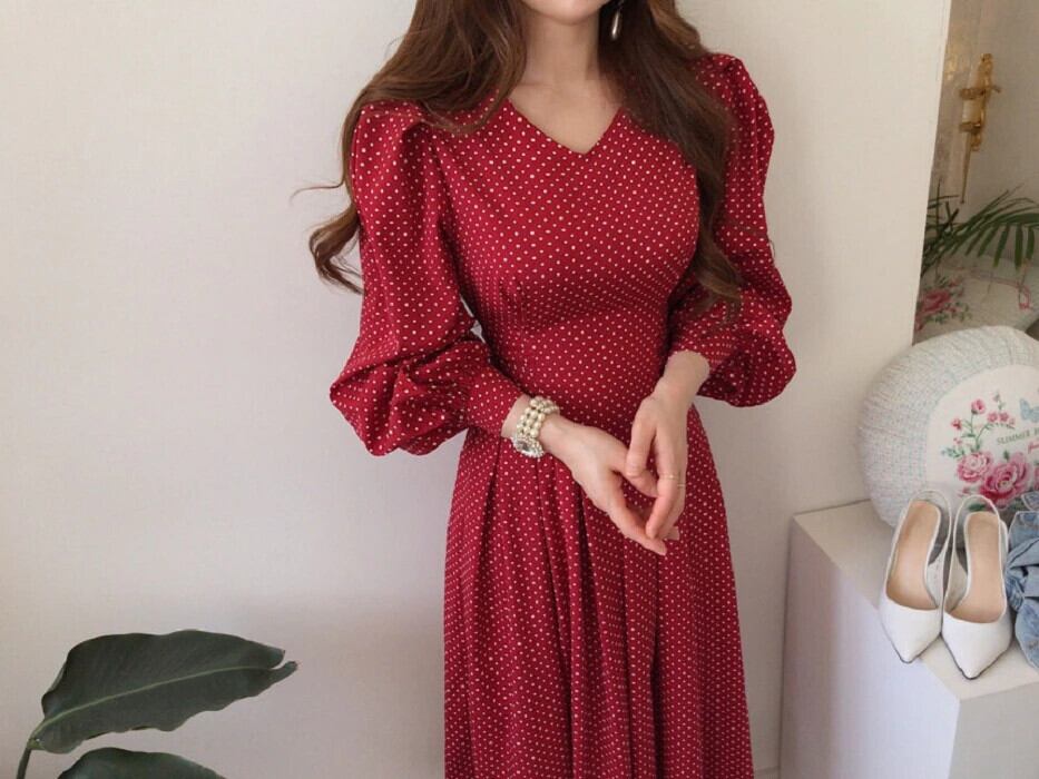 サマーシックコミュータードットレッドVネックプリントレディースドレスヴィンテージワンピース包帯ドレス 夏物 ビンテージ
