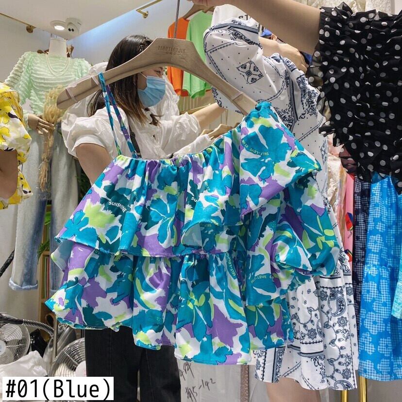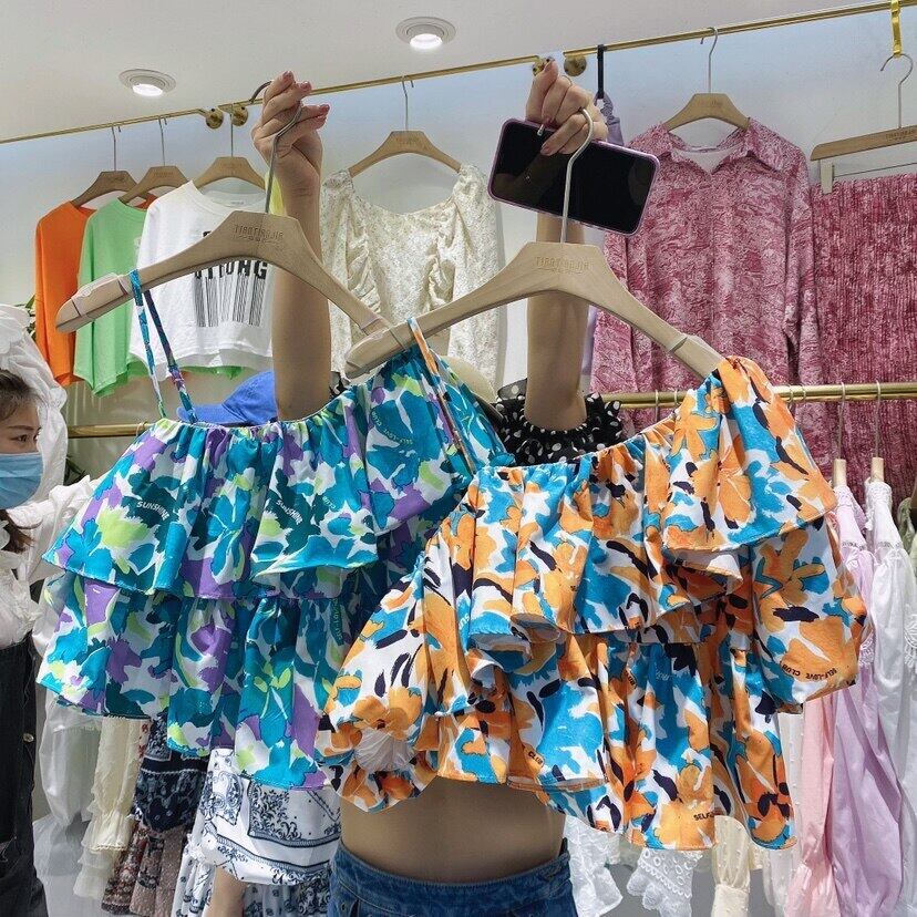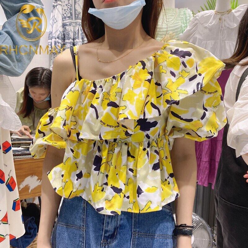 ヴィンテージプリントサマーシャツレディーススキューカラーパフスリーブパッチワークフリルスリムブラウスタイド 夏物 ビンテージ