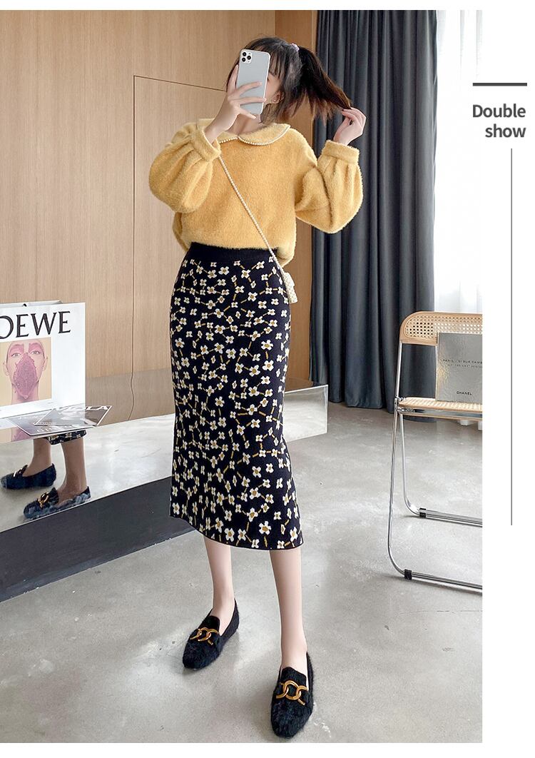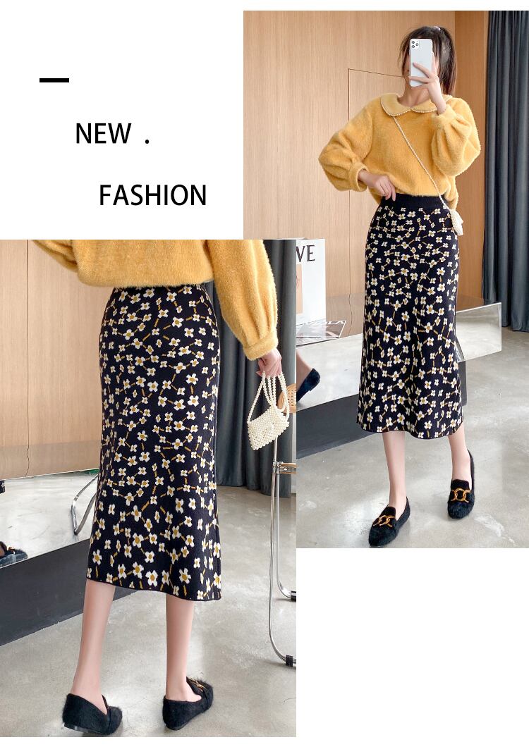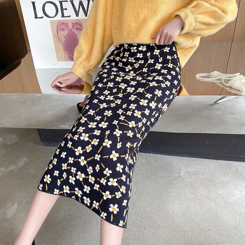 女性フローラルスリムニットスカート女性弾性ウエストペンシルボディコンセータースカートベーシックニットワークウェア秋 エラスティック 伸縮 オータム 秋物 花柄