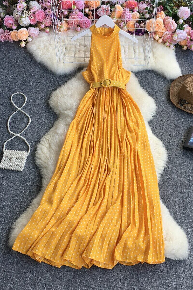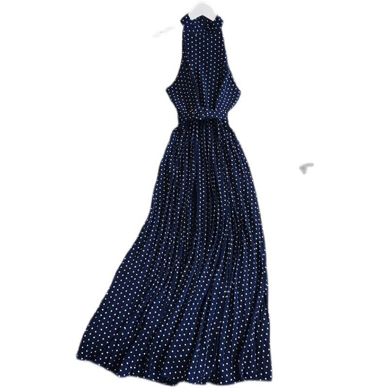 2021年夏のOネックノースリーブオフショルダードレスハイウエストレースアップ水玉プリントロングAラインプリーツドレス ハイウェスト サマー 夏物