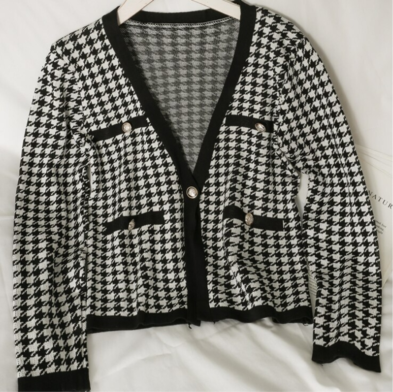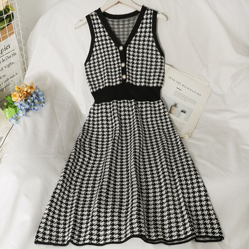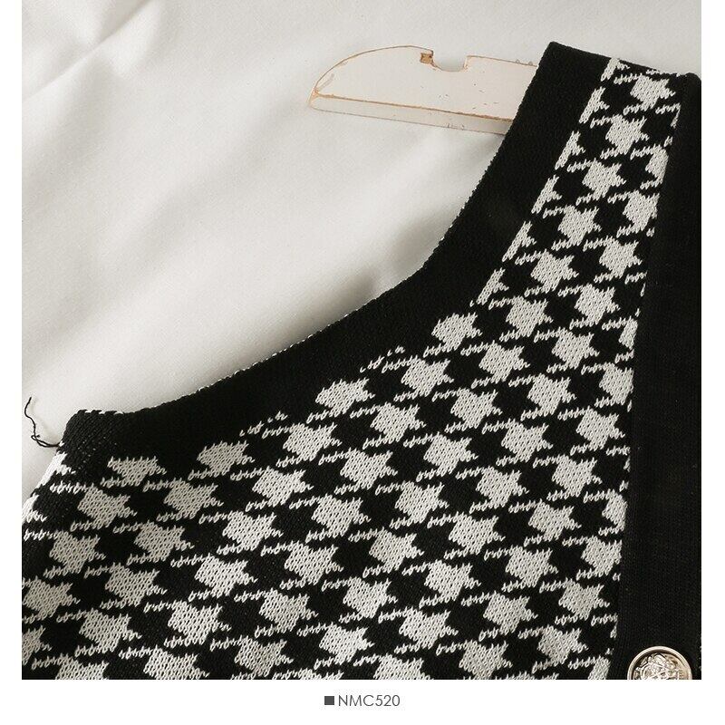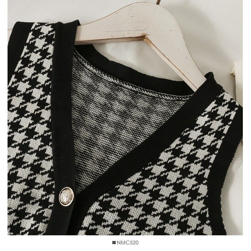 女性秋冬レトロ千鳥格子セット長袖ルーズカーディガン+ノースリーブAラインタンクドレスツーピースセット ロング オータム 秋物 ウィンター 冬物
