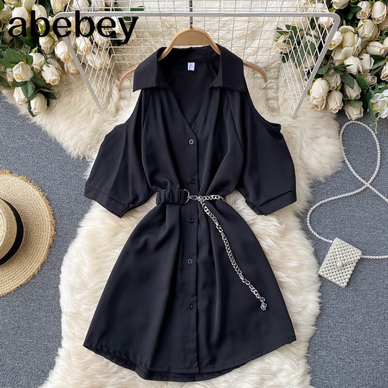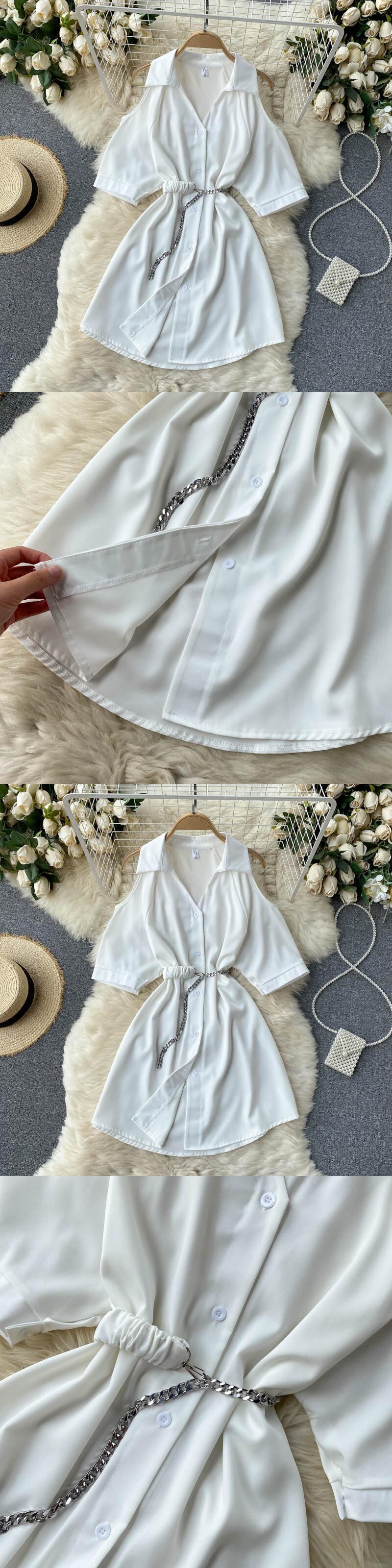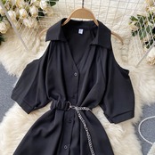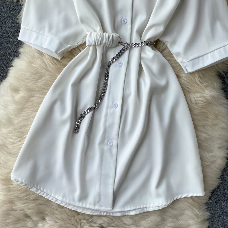 女性プリーツドレスターンダウン-襟ボタンサッシオフィスドレスサマーストリートウェアAラインショートドレス 夏物 会社 学校 通勤や通学にも
