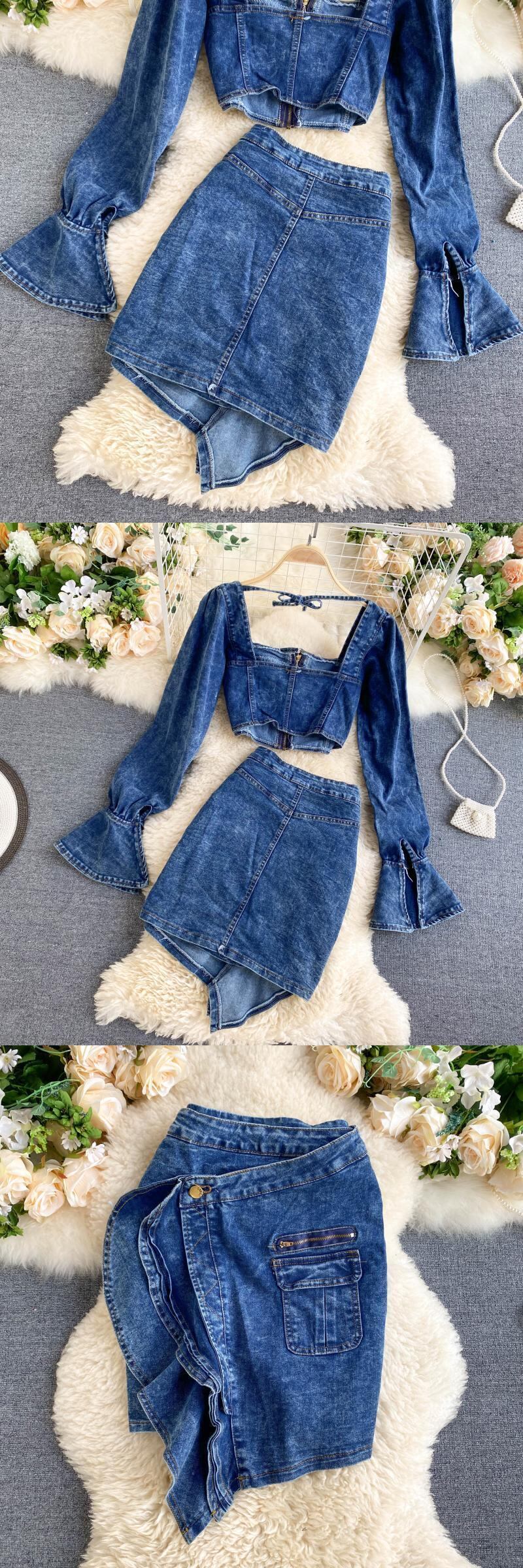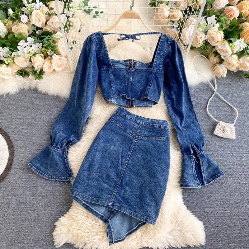 2021年秋ツーピースセットレディースセクシージーンズ22ピースセット長袖クロップトップスとボディコンショートデニムスカートスーツ女性 ロング オータム 秋物