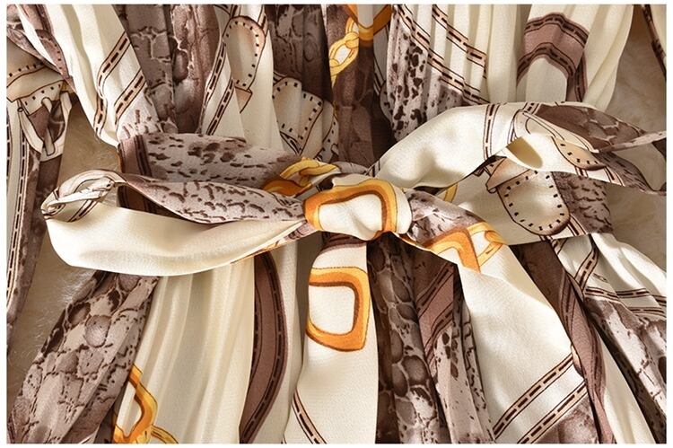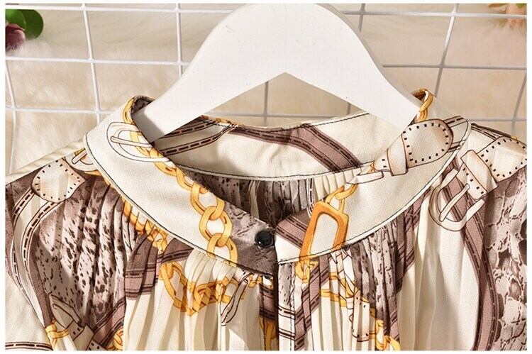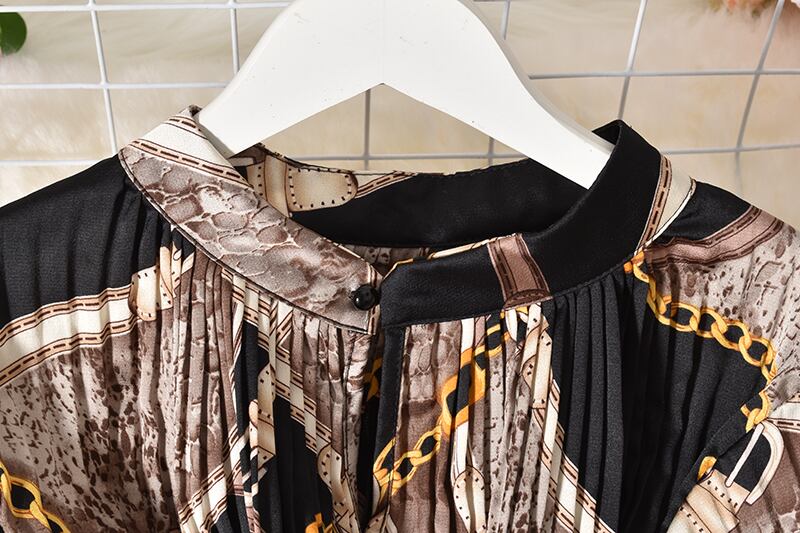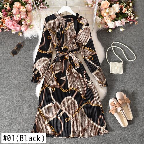女性ドレスOネック長袖薄プリーツドレスアーバンスリムプリントミッドカーフロングドレス
