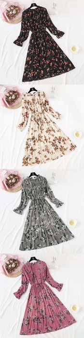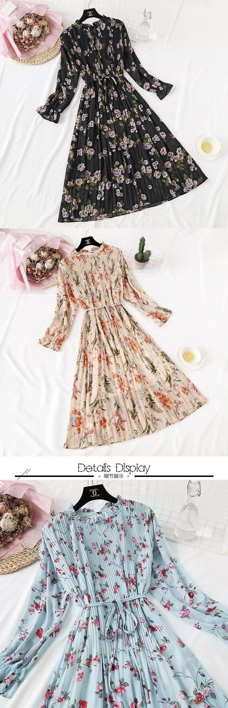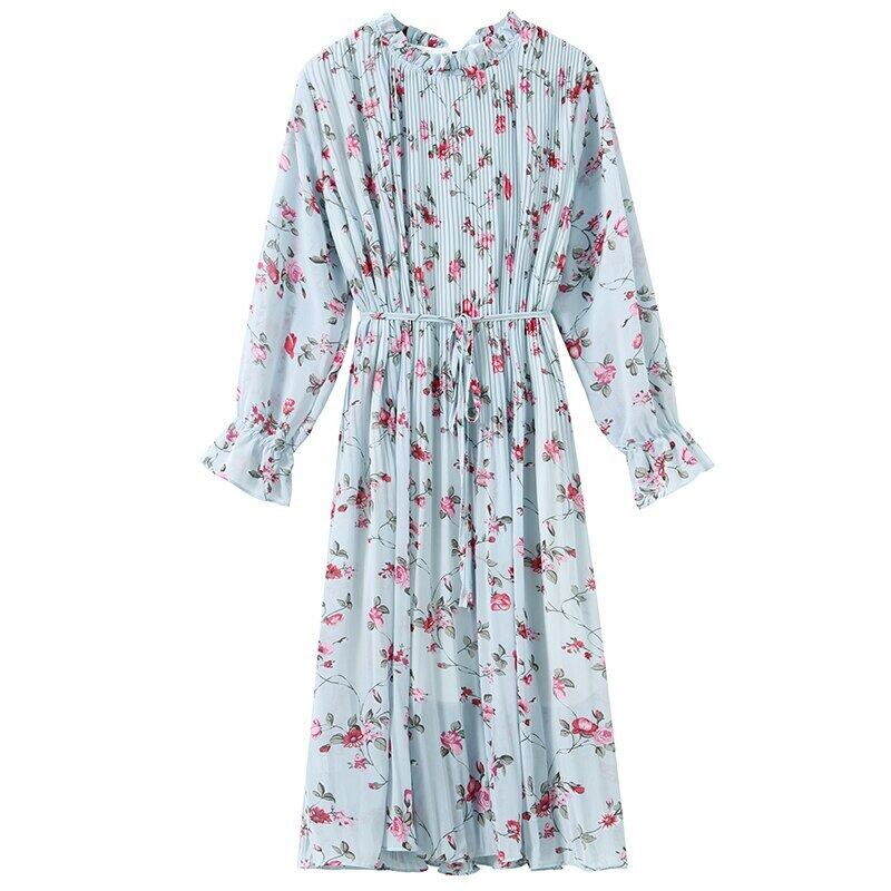 スタンドカラーフローラルプリントレディースドレスフルスリーブ伸縮性スリムウエストシフォンスプリングAラインロングドレス2021 エラスティック 春物 花柄