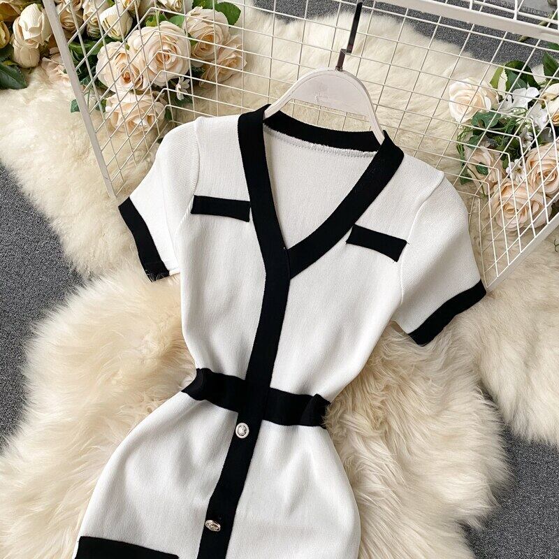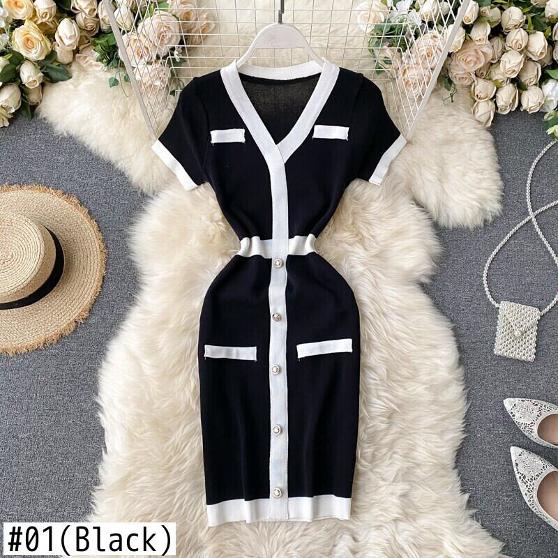 スタイルVネックボタンドレス夏半袖女性ニットボディコンドレス作業着オフィスドレス ショート ハーフスリーブ サマー 夏物 会社 学校 通勤や通学にも