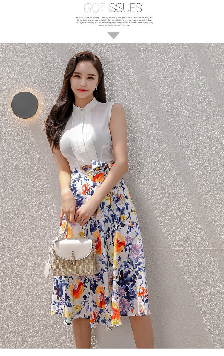 レディースサマー2ピーススーツ ホワイトノースリーブシャツトップスとレースアッププリントスカートOLワークウェアセット 夏物
