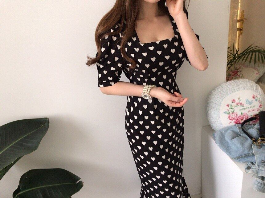 ヴィンテージスクエアカラーレディースサマードレスラブプリント半袖シフォンドレスマーメイドドレス ショート ハーフスリーブ 夏物 スクウェア ビンテージ