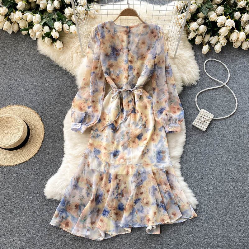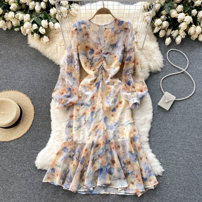 女性シフォンフローラルドレスフレンチパフスリーブVネックフリルマーメイドドレス秋のボヘミアンバケーションミディドレス ラッフル オータム 秋物 花柄