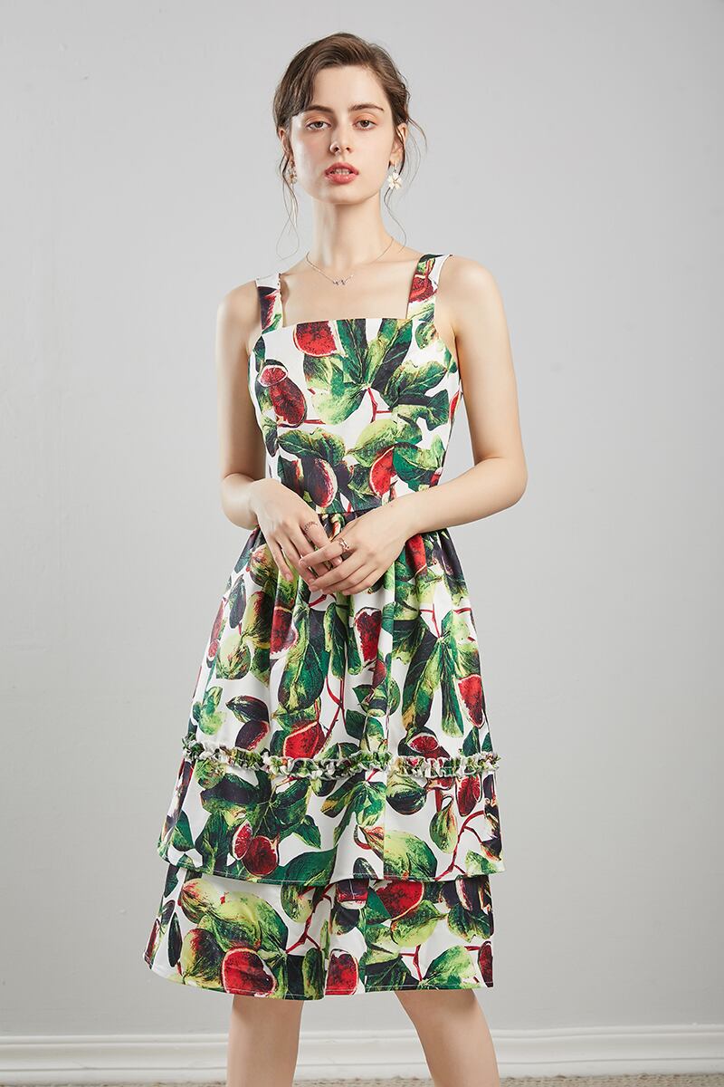 サマースクエアカラースパゲッティストラップノースリーブAラインプリントスリムニードレスレディースプリーツドレス 夏物 スクウェア