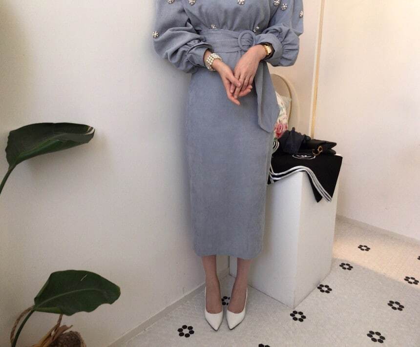 秋フローラルビーディングコーデュロイロングドレスレディースランタンスリーブOネックサッシペンシルドレスVestidos オータム 秋物 花柄