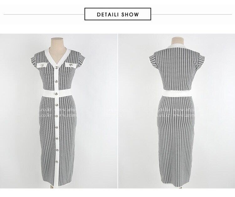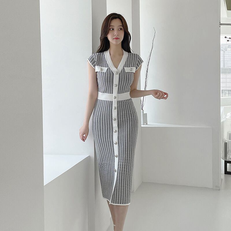 シングルブレストボトムドレス女性夏Vネック伸縮性ニットシースペンシルドレスOLオフィスウェアVestidos エラスティック サマー 夏物 会社 学校 通勤や通学にも
