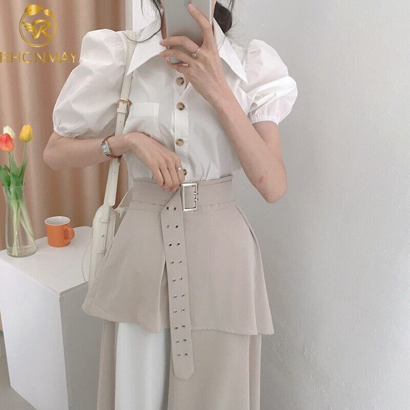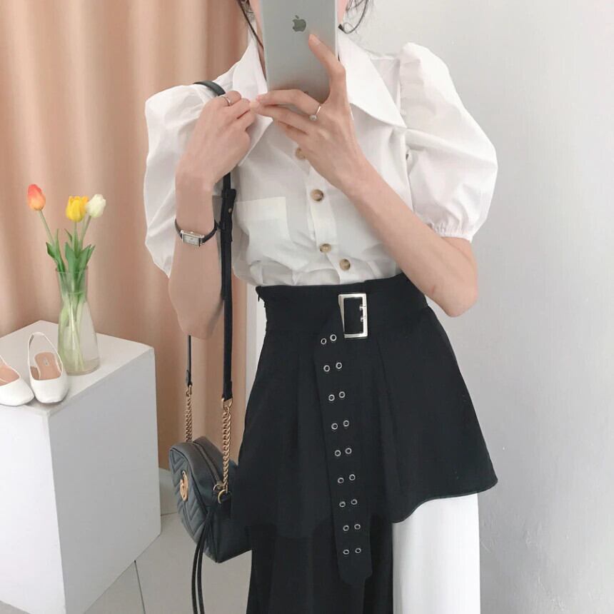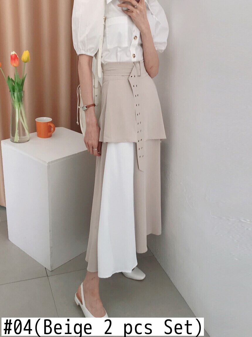 サマースカートセットシックな女性のパフスリーブトップ+パッチワークプリーツロングスカートスーツ2ピースセット 夏物