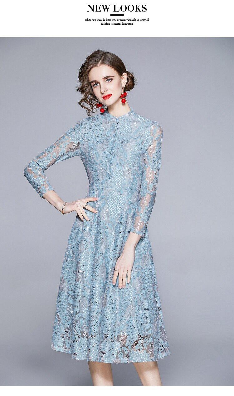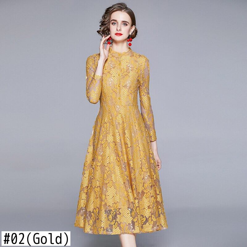 2021年夏の気質の女性のレーススリムロングドレスヴィンテージイエロー/ブルーレースオーバーミディAラインドレス サマー 夏物 ビンテージ